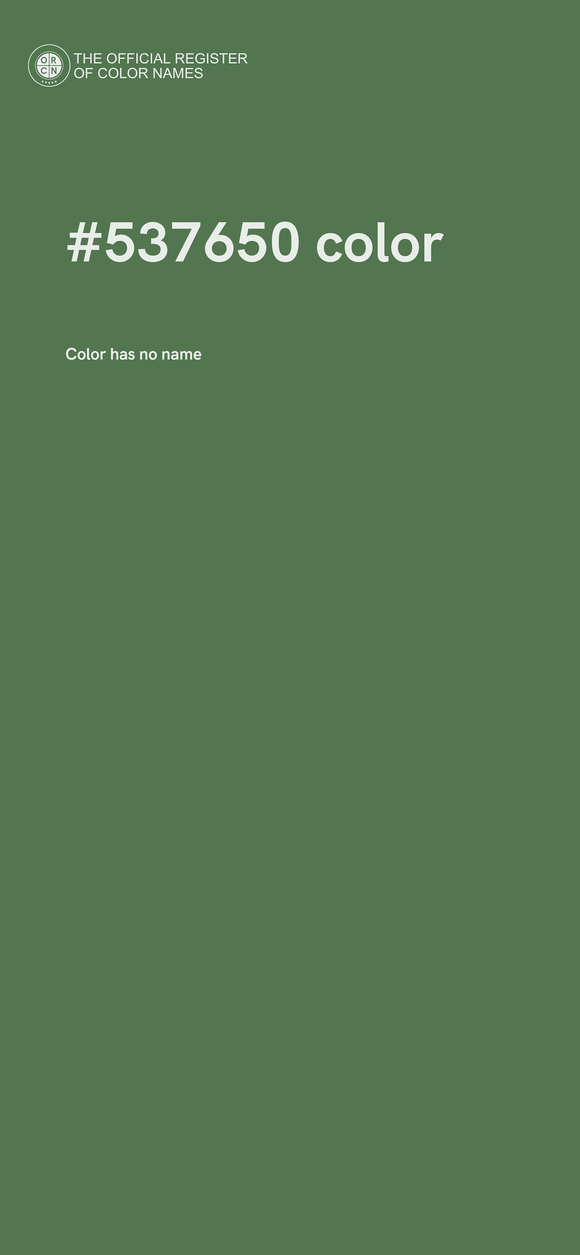 The digital color HEX #537650 belongs to the Green Color Family featuring Low Saturation (Saturation Family) and Neutral (Brightness Family).