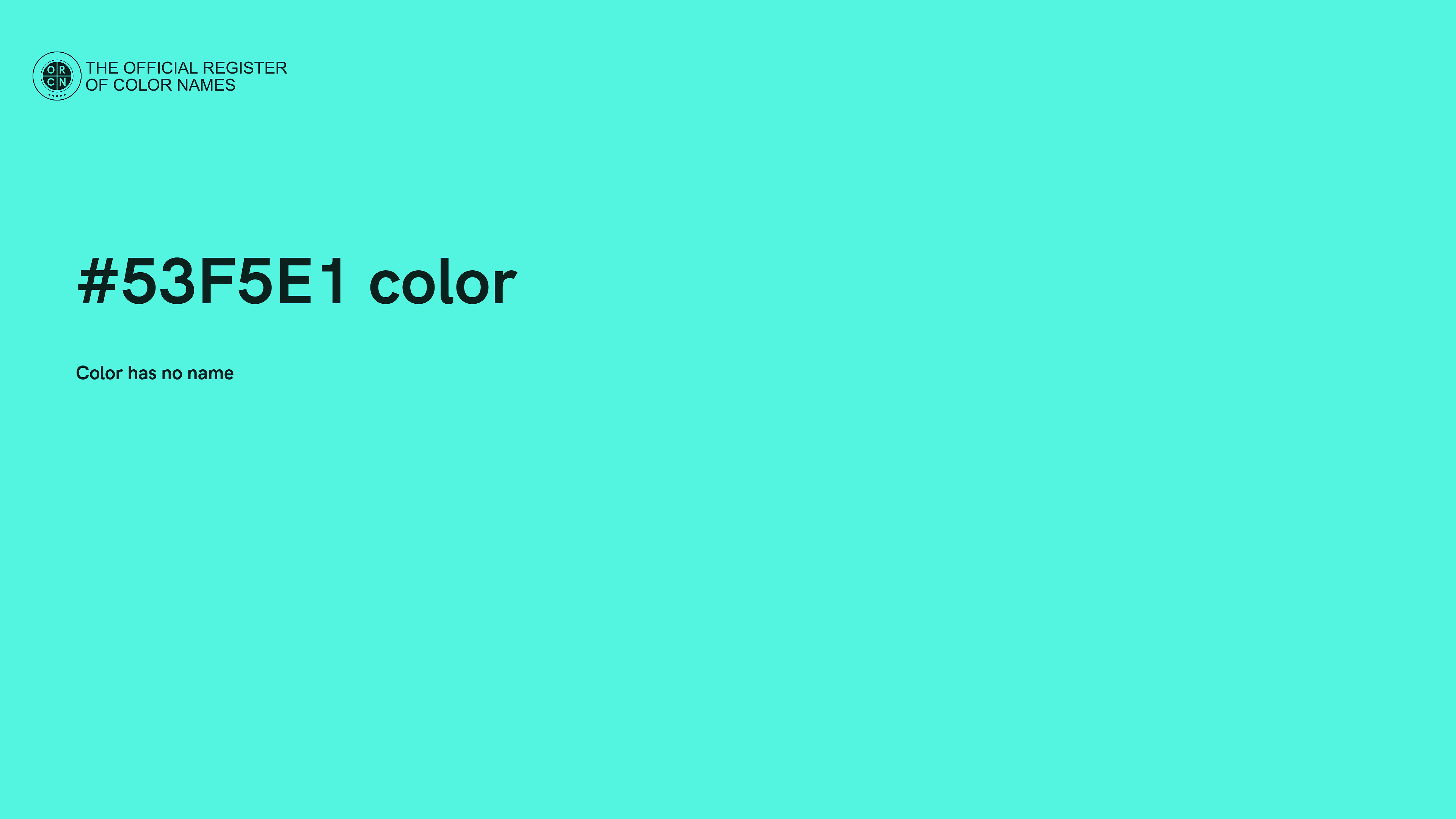 The digital color HEX #53F5E1 belongs to the Cyan Color Family featuring Full Saturation (Saturation Family) and Very Light (Brightness Family).