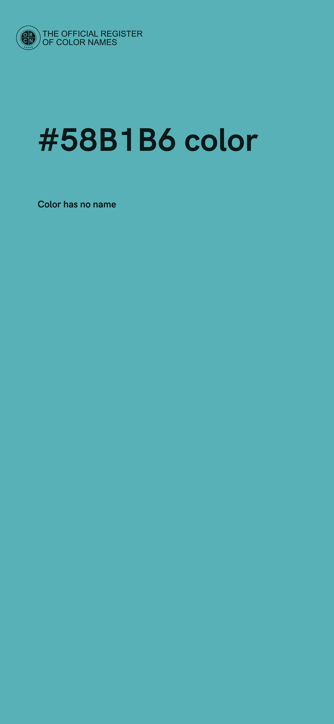 The digital color HEX #58B1B6 belongs to the Cyan Color Family featuring Mild Saturation (Saturation Family) and Light (Brightness Family).