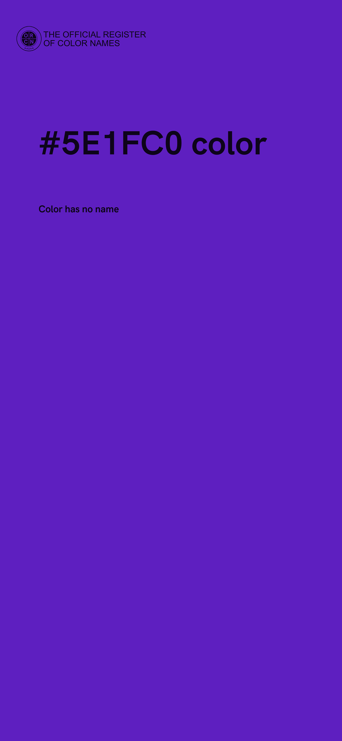 The digital color HEX #5E1FC0 belongs to the Violet Color Family featuring High Saturation (Saturation Family) and Light (Brightness Family).
