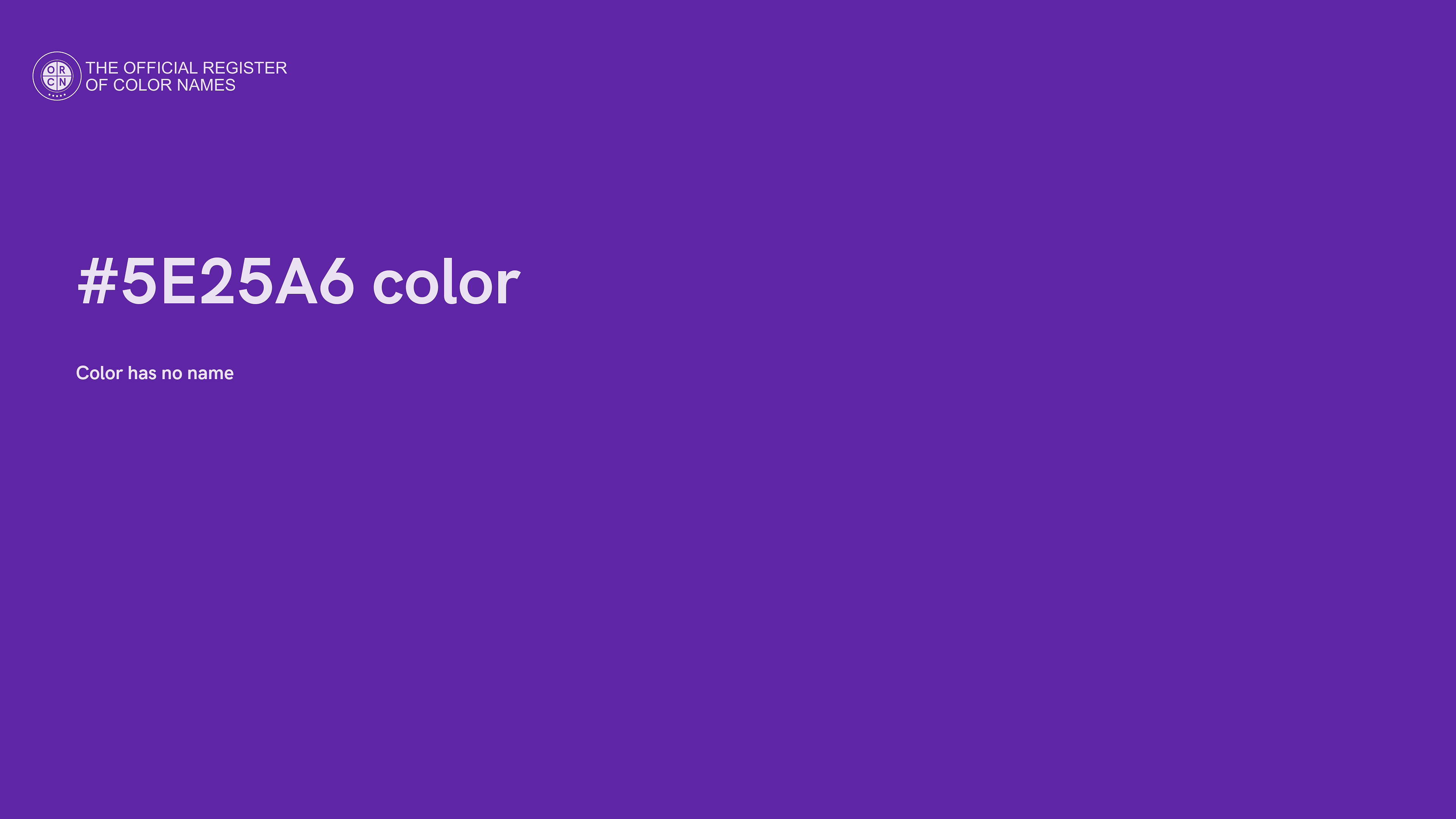 For printing in non digital world, #5E25A6 is represented in CMYK as 28 Cyan, 51 Magenta, 0 Yellow, and 35 Black (Key) (C:28 M:51 Y:0 K:35).
