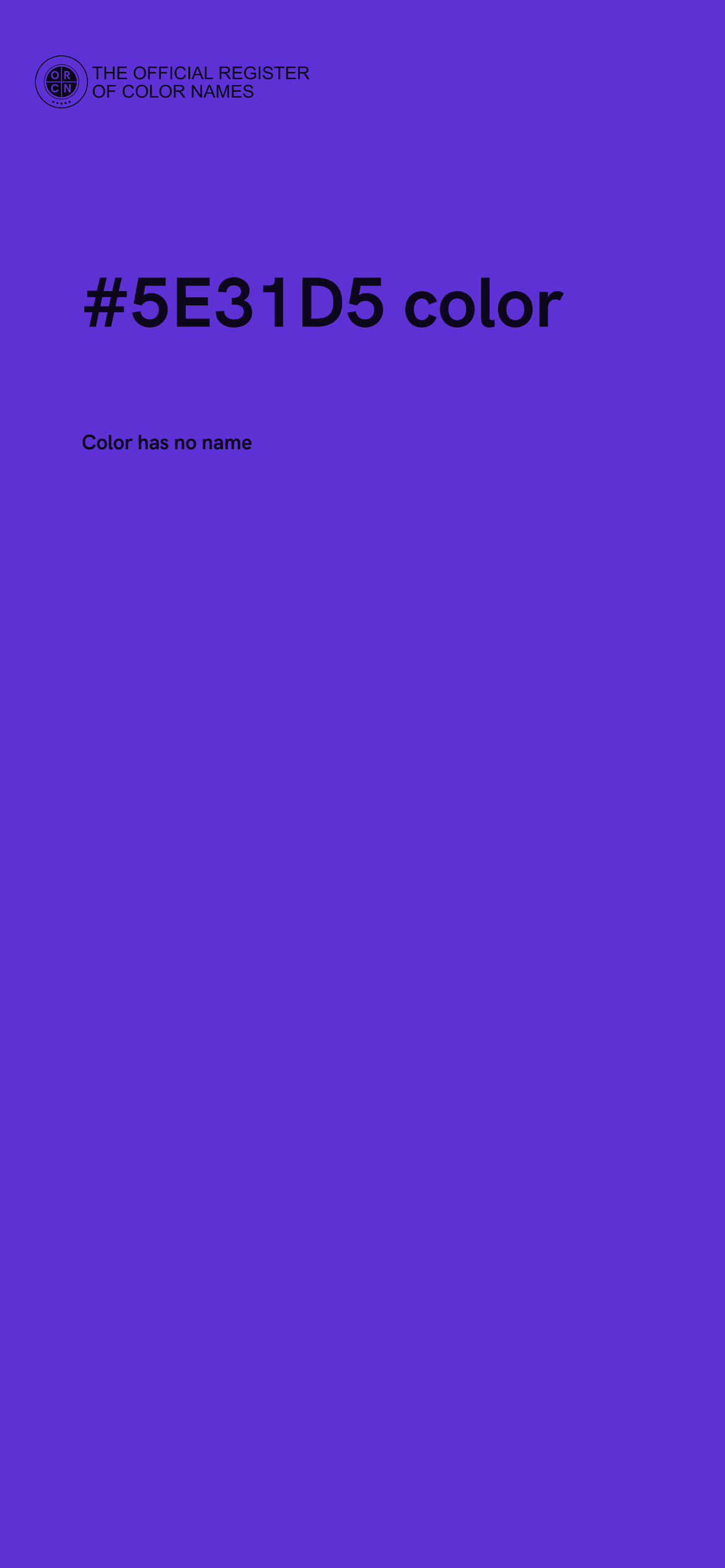 For printing in non digital world, #5E31D5 is represented in CMYK as 47 Cyan, 64 Magenta, 0 Yellow, and 16 Black (Key) (C:47 M:64 Y:0 K:16).
