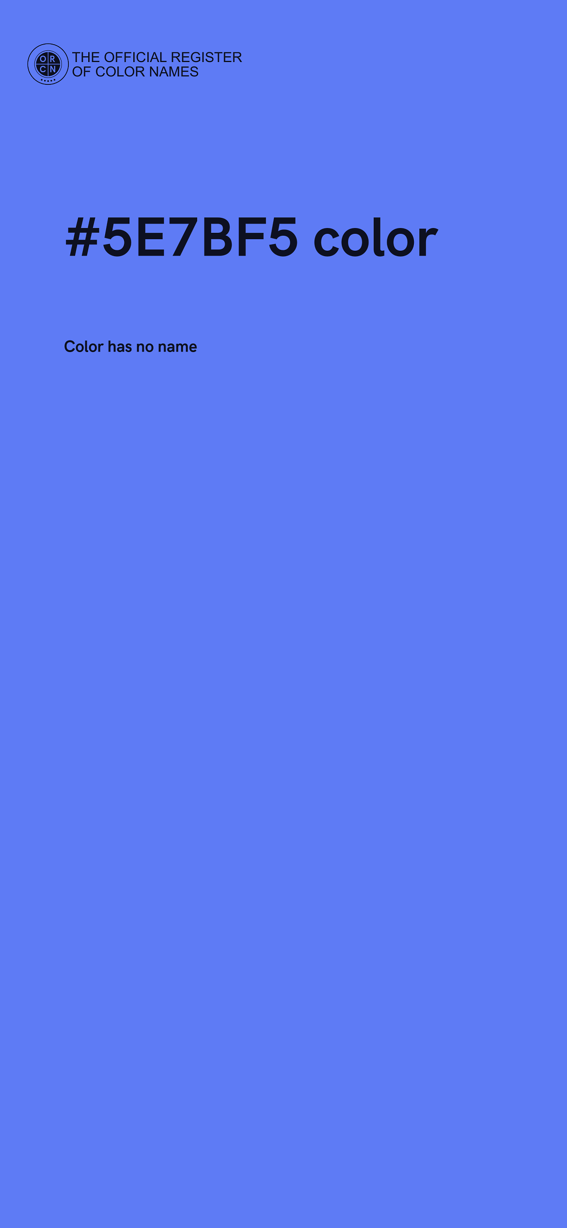 The digital color HEX #5E7BF5 belongs to the Blue Color Family featuring Full Saturation (Saturation Family) and Very Light (Brightness Family).