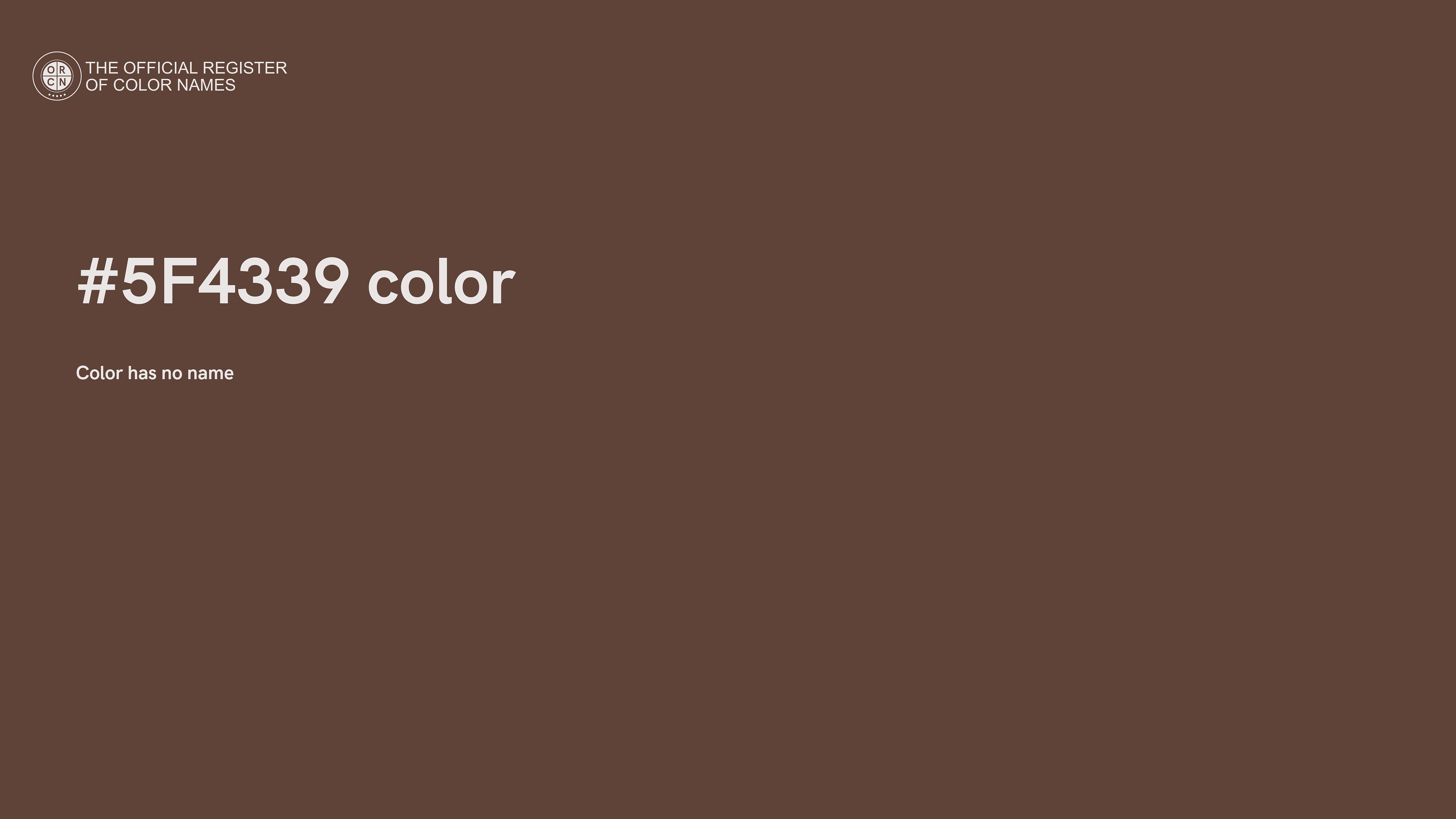 The digital color HEX #5F4339 belongs to the Orange Color Family featuring Mild Saturation (Saturation Family) and Neutral (Brightness Family).