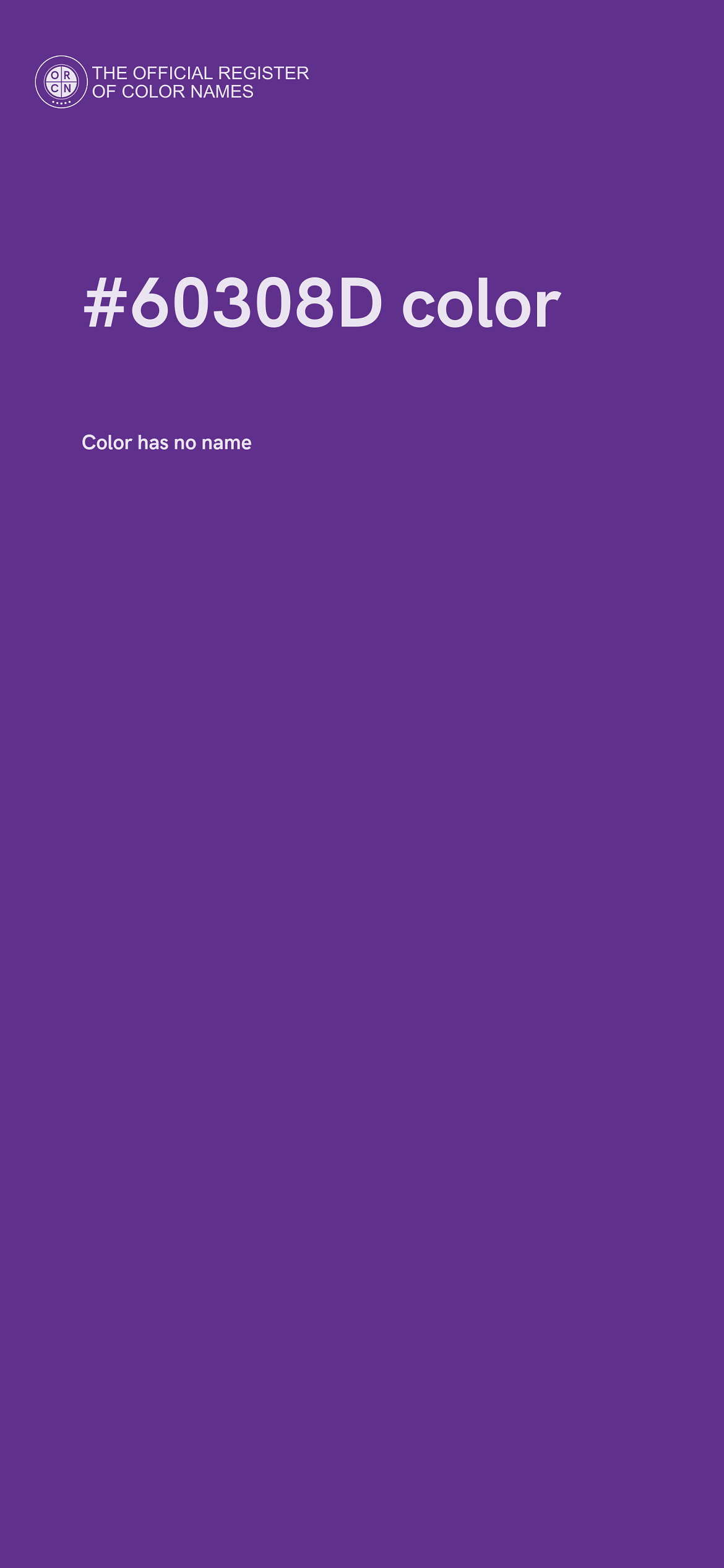 The digital color HEX #60308D belongs to the Violet Color Family featuring Moderate Saturation (Saturation Family) and Neutral (Brightness Family).