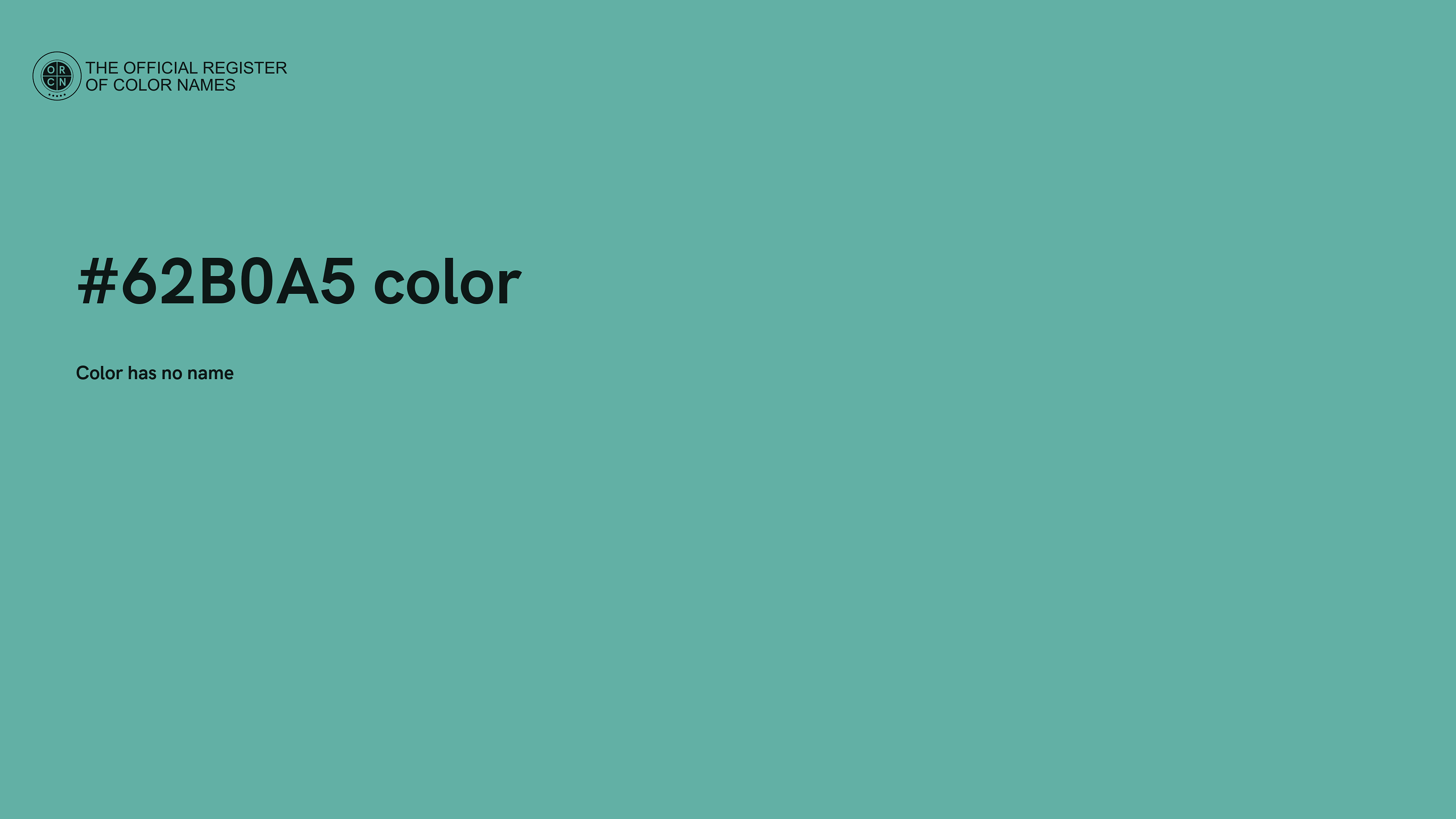The digital color HEX #62B0A5 belongs to the Cyan Color Family featuring Mild Saturation (Saturation Family) and Light (Brightness Family).
