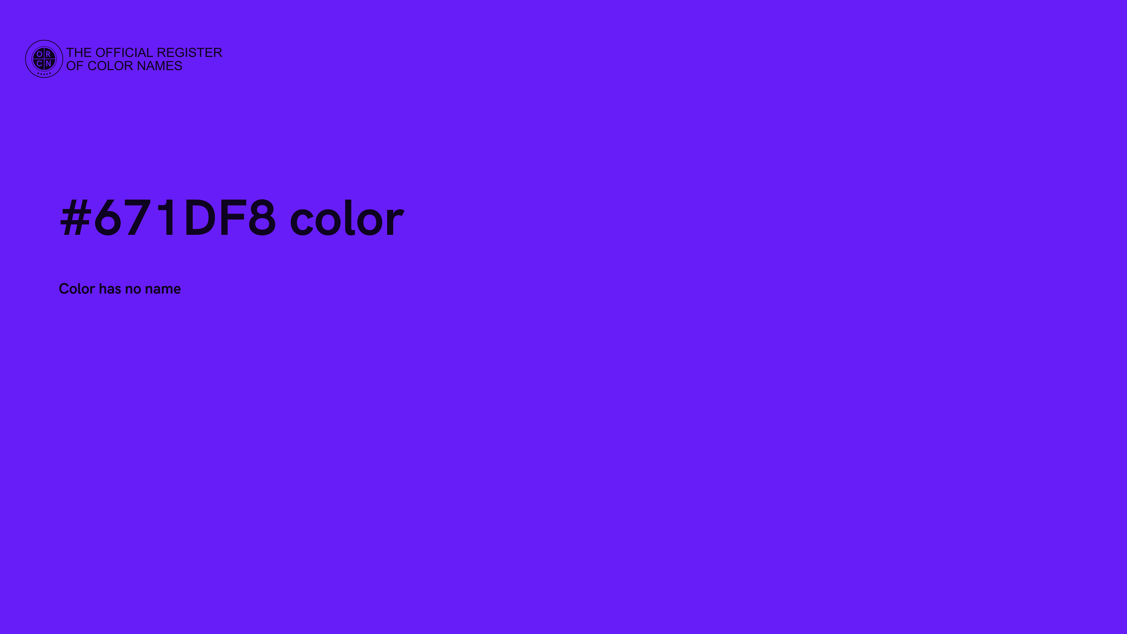 For printing in non digital world, #671DF8 is represented in CMYK as 57 Cyan, 86 Magenta, 0 Yellow, and 3 Black (Key) (C:57 M:86 Y:0 K:3).