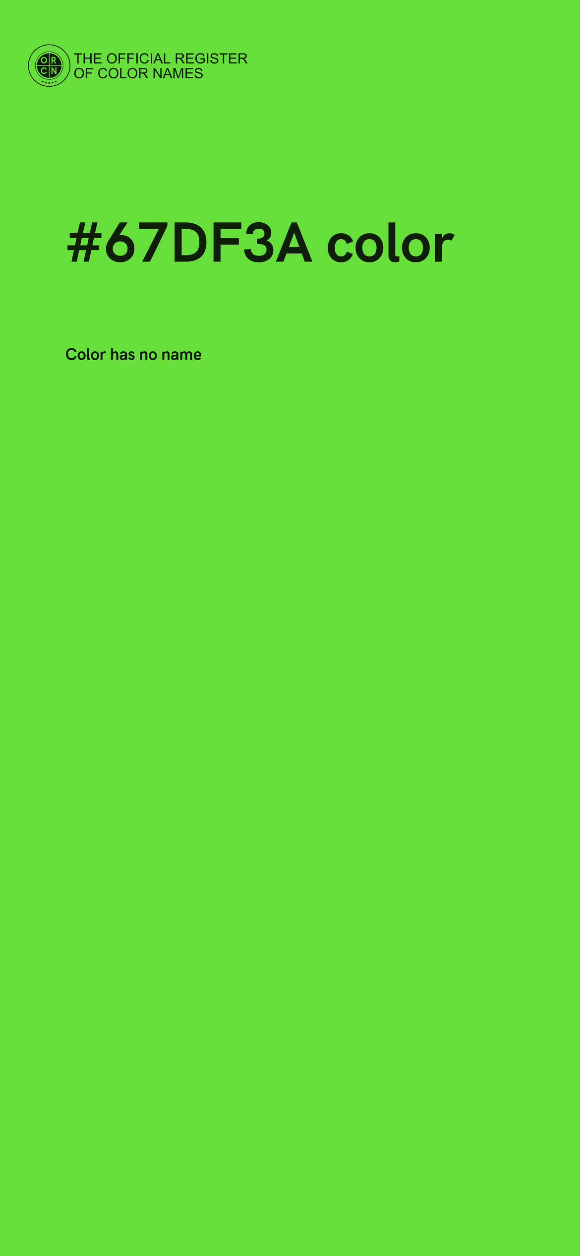 The digital color HEX #67DF3A belongs to the Chartreuse Color Family featuring High Saturation (Saturation Family) and Light (Brightness Family).