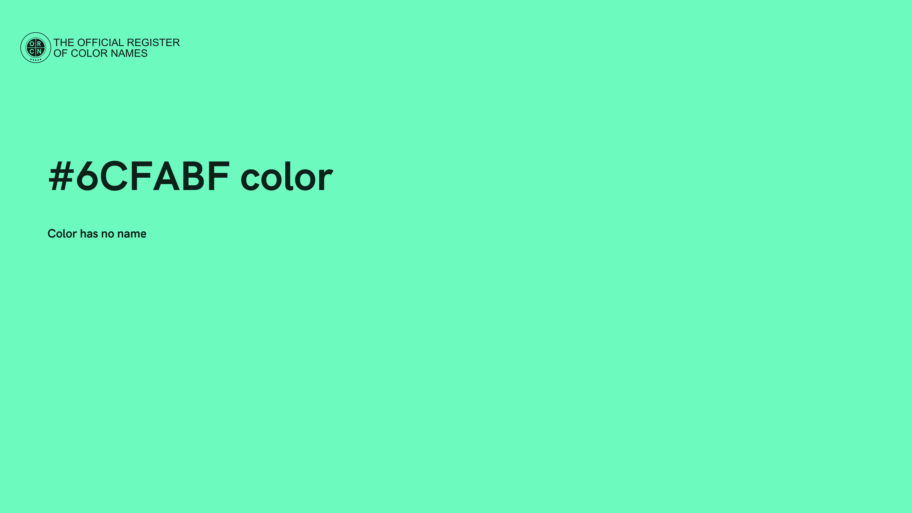 The digital color HEX #6CFABF belongs to the Spring Green Color Family featuring Full Saturation (Saturation Family) and Very Light (Brightness Family).