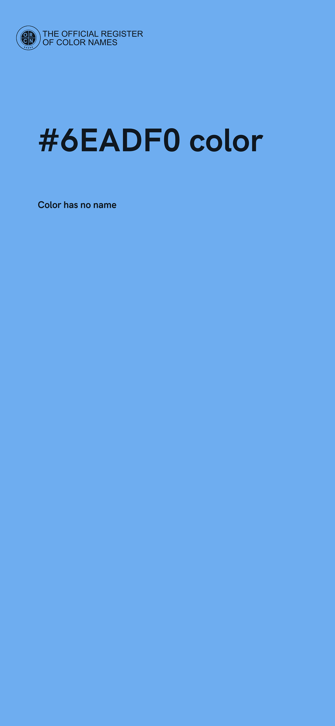 The digital color HEX #6EADF0 belongs to the Azure Color Family featuring High Saturation (Saturation Family) and Very Light (Brightness Family).