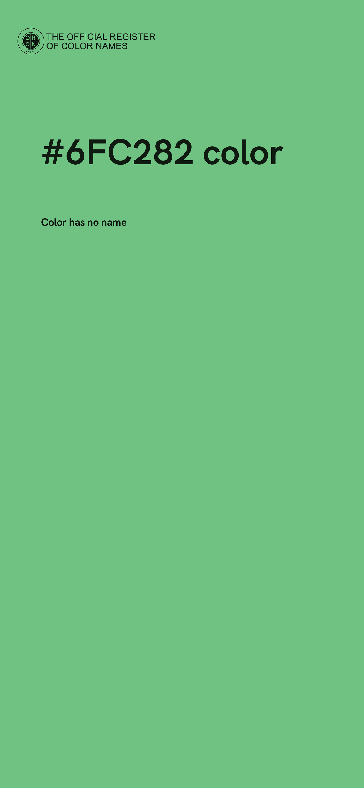The digital color HEX #6FC282 belongs to the Green Color Family featuring Moderate Saturation (Saturation Family) and Very Light (Brightness Family).