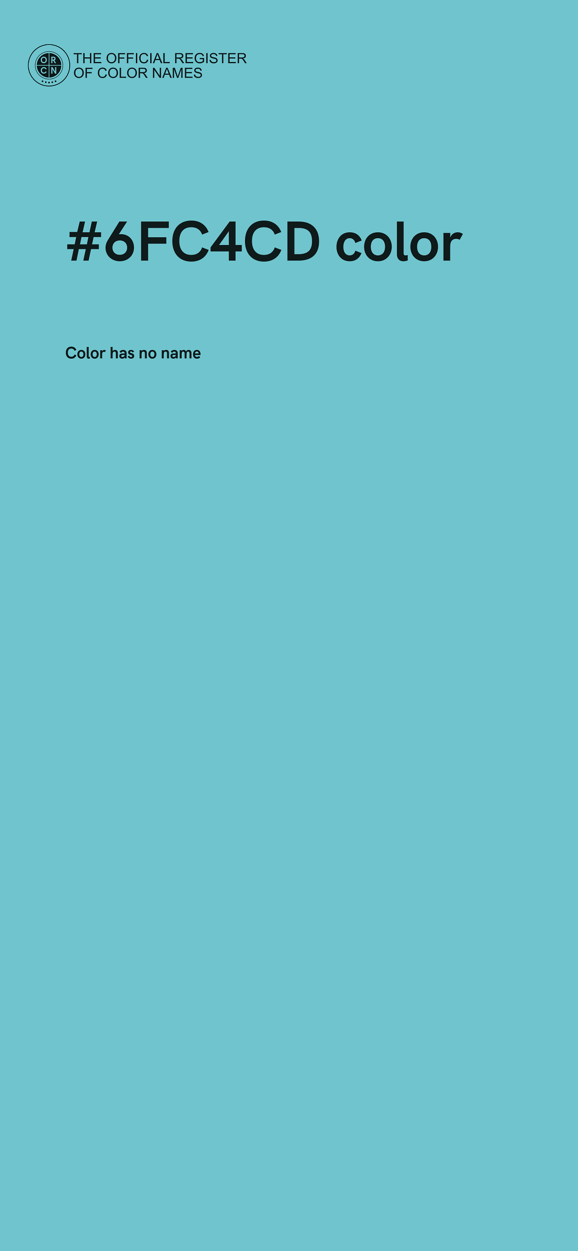 The digital color HEX #6FC4CD belongs to the Cyan Color Family featuring Moderate Saturation (Saturation Family) and Very Light (Brightness Family).