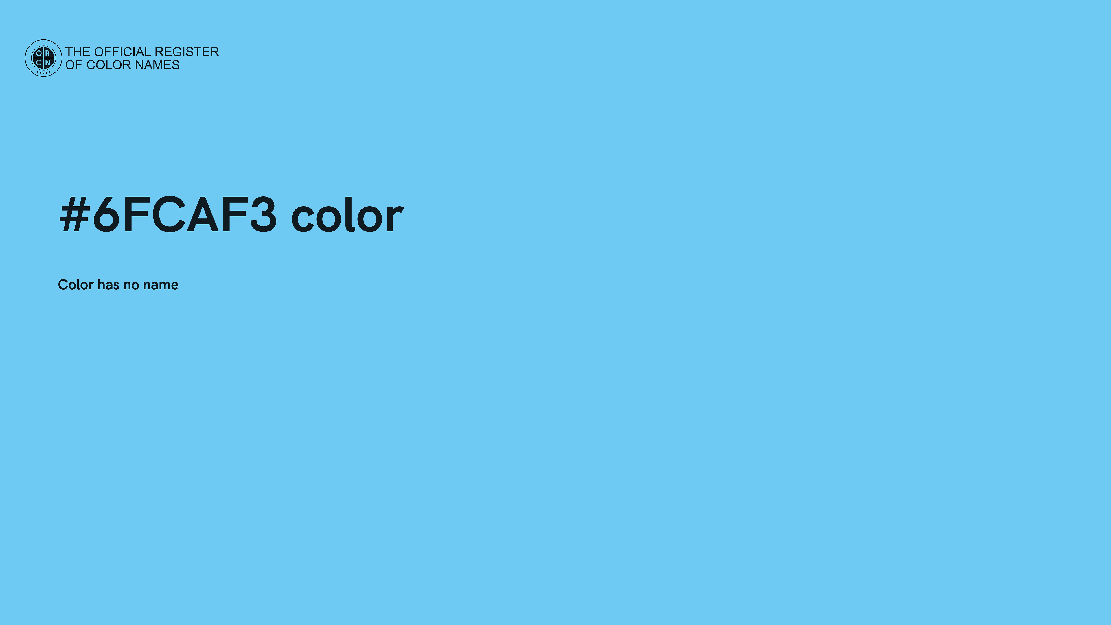 The digital color HEX #6FCAF3 belongs to the Azure Color Family featuring Full Saturation (Saturation Family) and Very Light (Brightness Family).