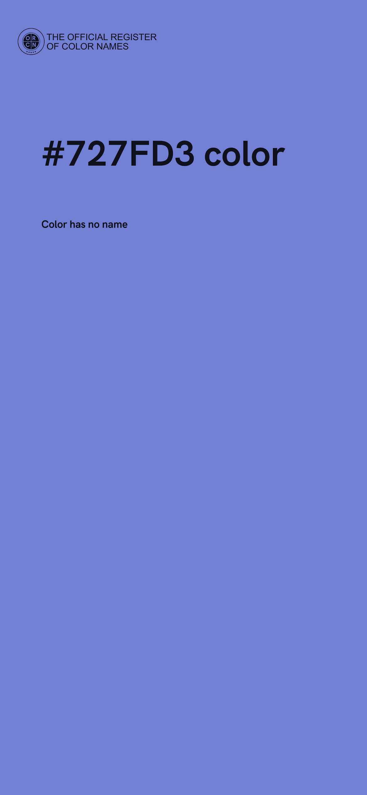 The digital color HEX #727FD3 belongs to the Blue Color Family featuring Moderate Saturation (Saturation Family) and Very Light (Brightness Family).