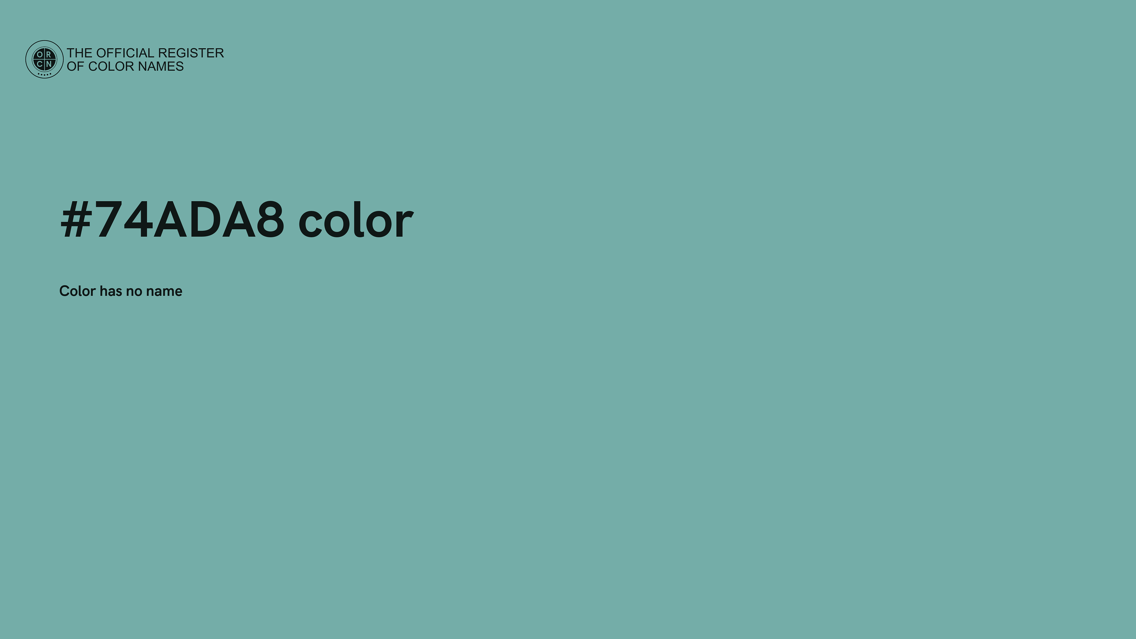 The digital color HEX #74ADA8 belongs to the Cyan Color Family featuring Mild Saturation (Saturation Family) and Light (Brightness Family).