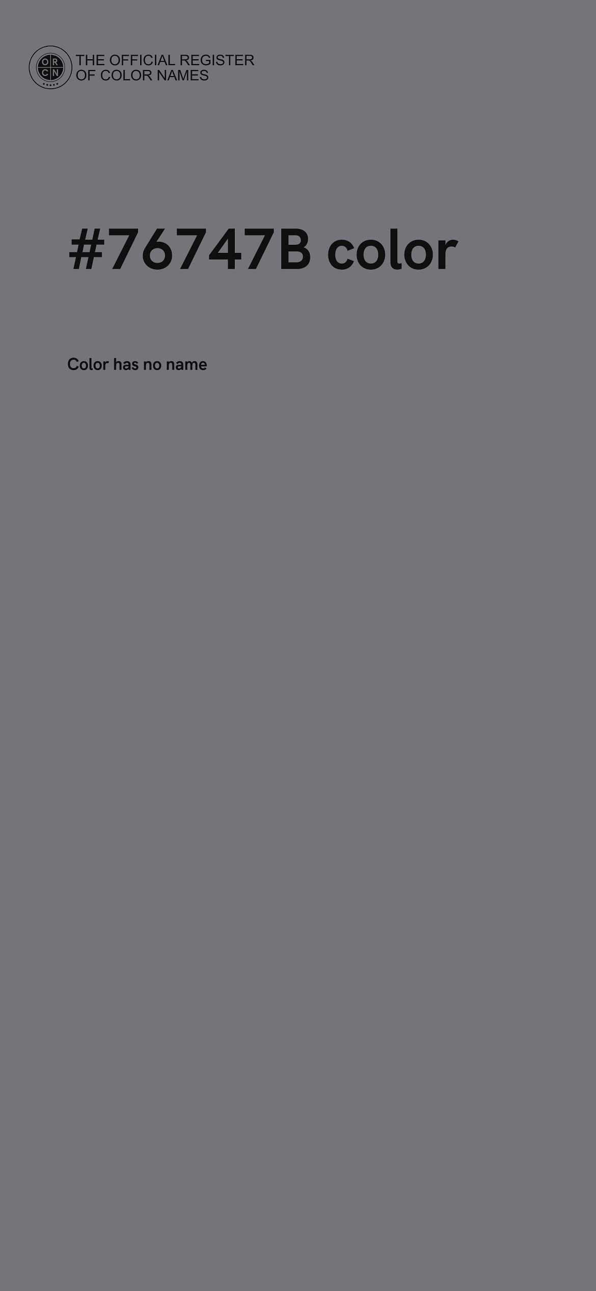 For printing in non digital world, #76747B is represented in CMYK as 2 Cyan, 3 Magenta, 0 Yellow, and 52 Black (Key) (C:2 M:3 Y:0 K:52).