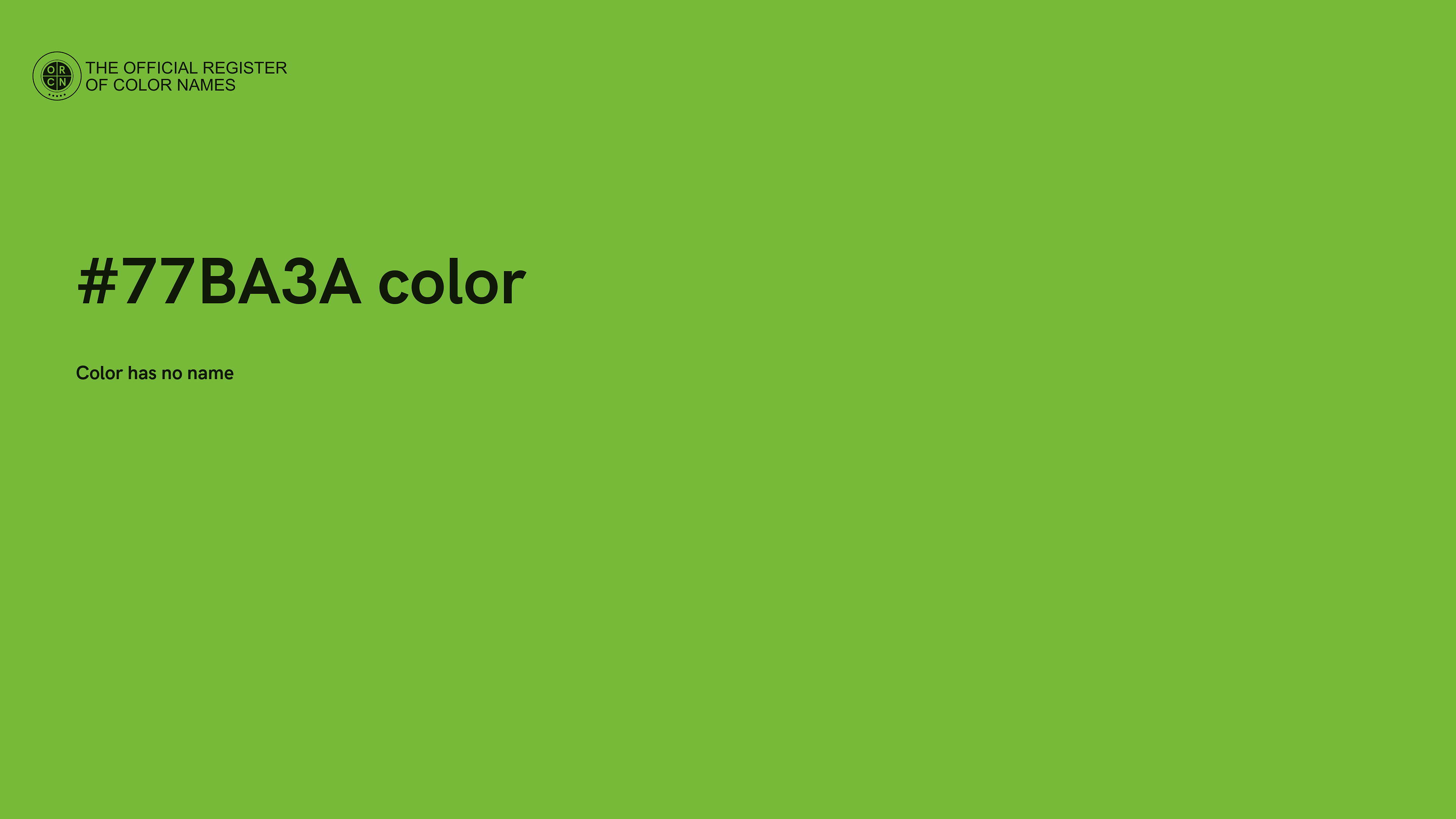 The digital color HEX #77BA3A belongs to the Chartreuse Color Family featuring Moderate Saturation (Saturation Family) and Light (Brightness Family).