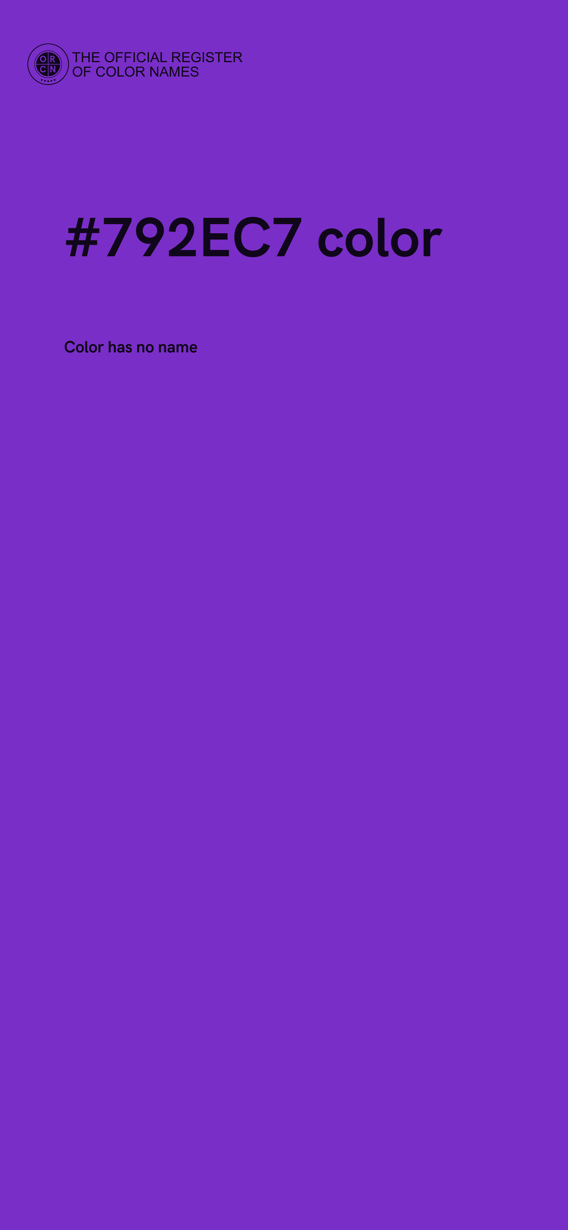 The digital color HEX #792EC7 belongs to the Violet Color Family featuring High Saturation (Saturation Family) and Light (Brightness Family).