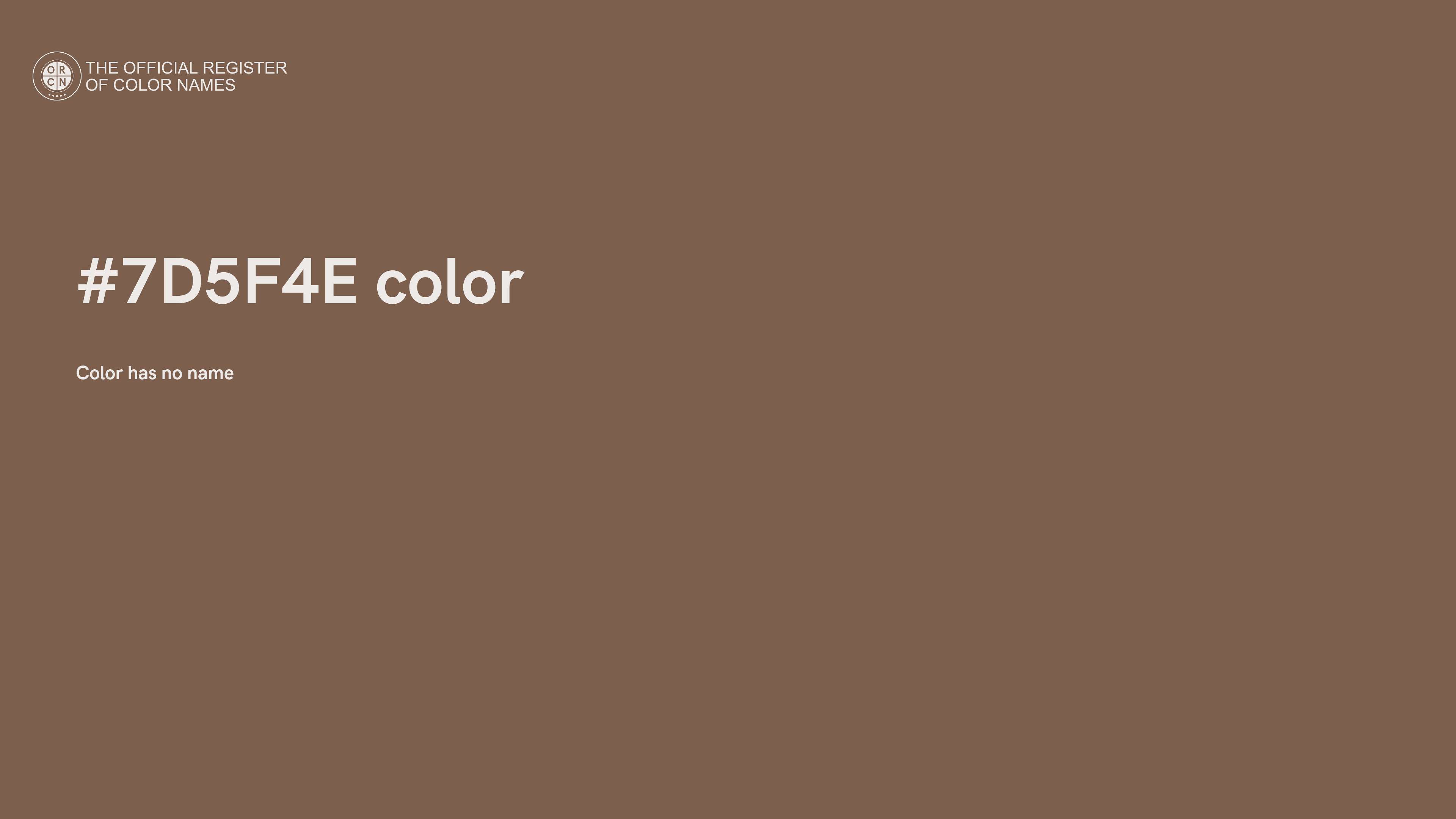 The digital color HEX #7D5F4E belongs to the Orange Color Family featuring Low Saturation (Saturation Family) and Light (Brightness Family).