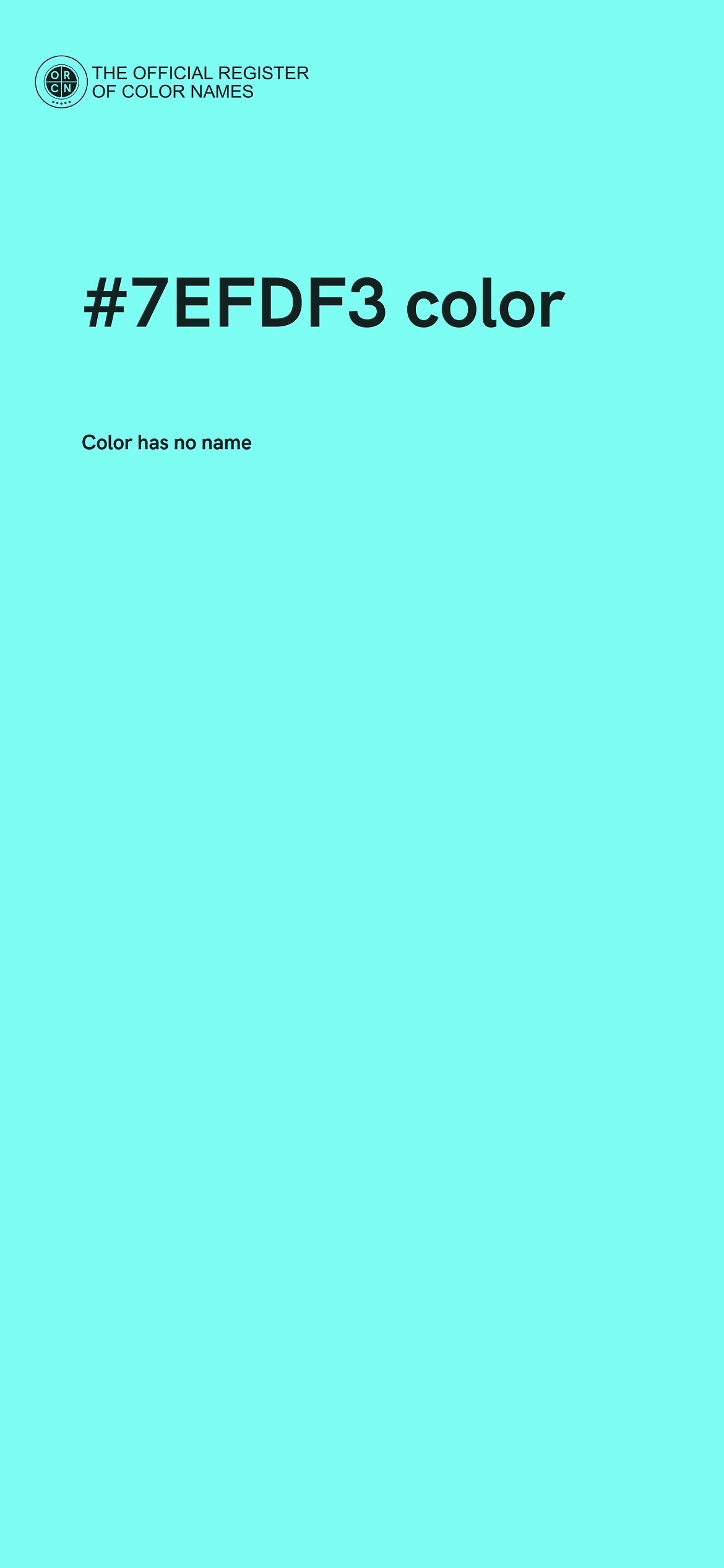 The digital color HEX #7EFDF3 belongs to the Cyan Color Family featuring Full Saturation (Saturation Family) and Very Light (Brightness Family).