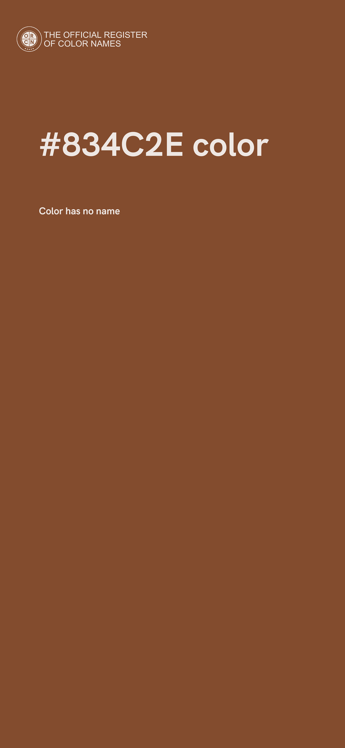 The digital color HEX #834C2E belongs to the Orange Color Family featuring Moderate Saturation (Saturation Family) and Neutral (Brightness Family).