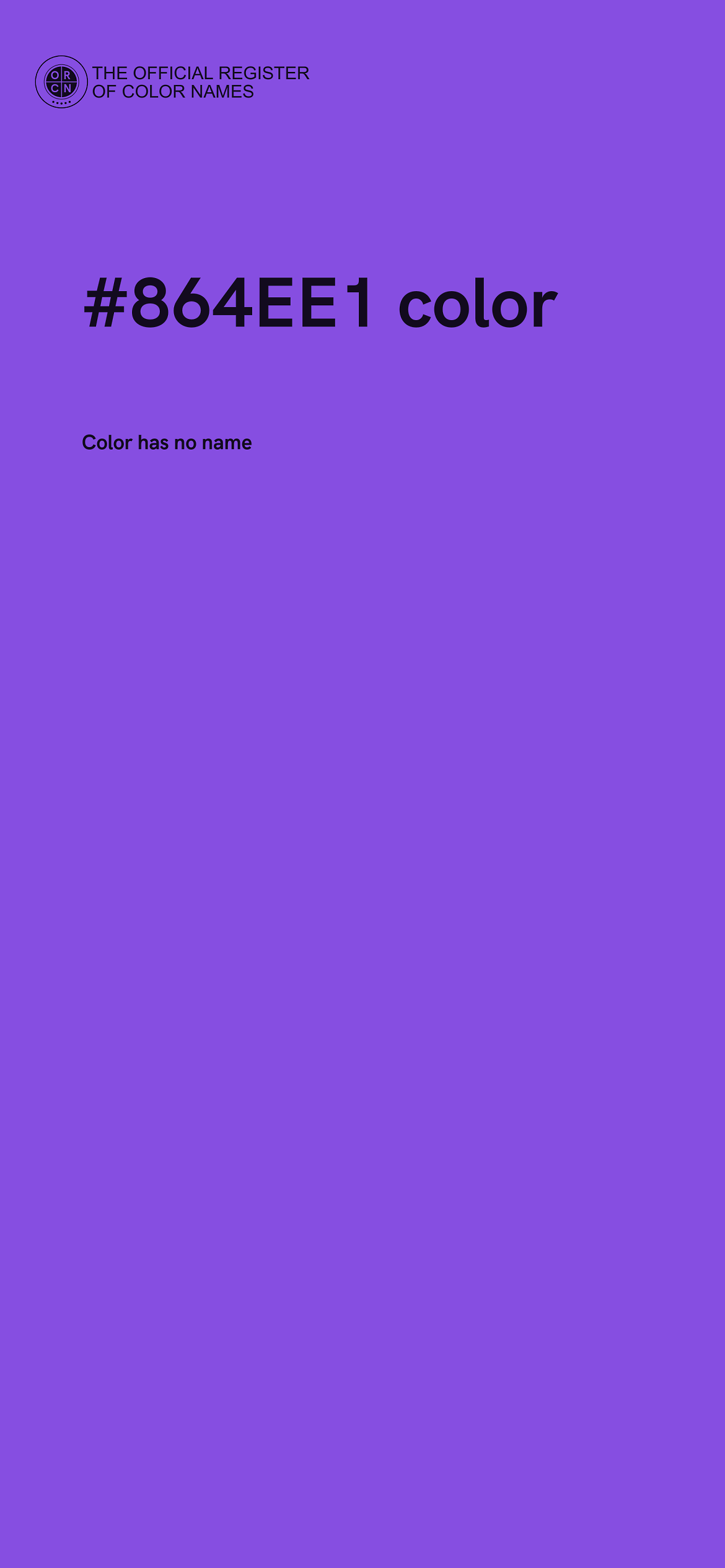 For printing in non digital world, #864EE1 is represented in CMYK as 36 Cyan, 58 Magenta, 0 Yellow, and 12 Black (Key) (C:36 M:58 Y:0 K:12).