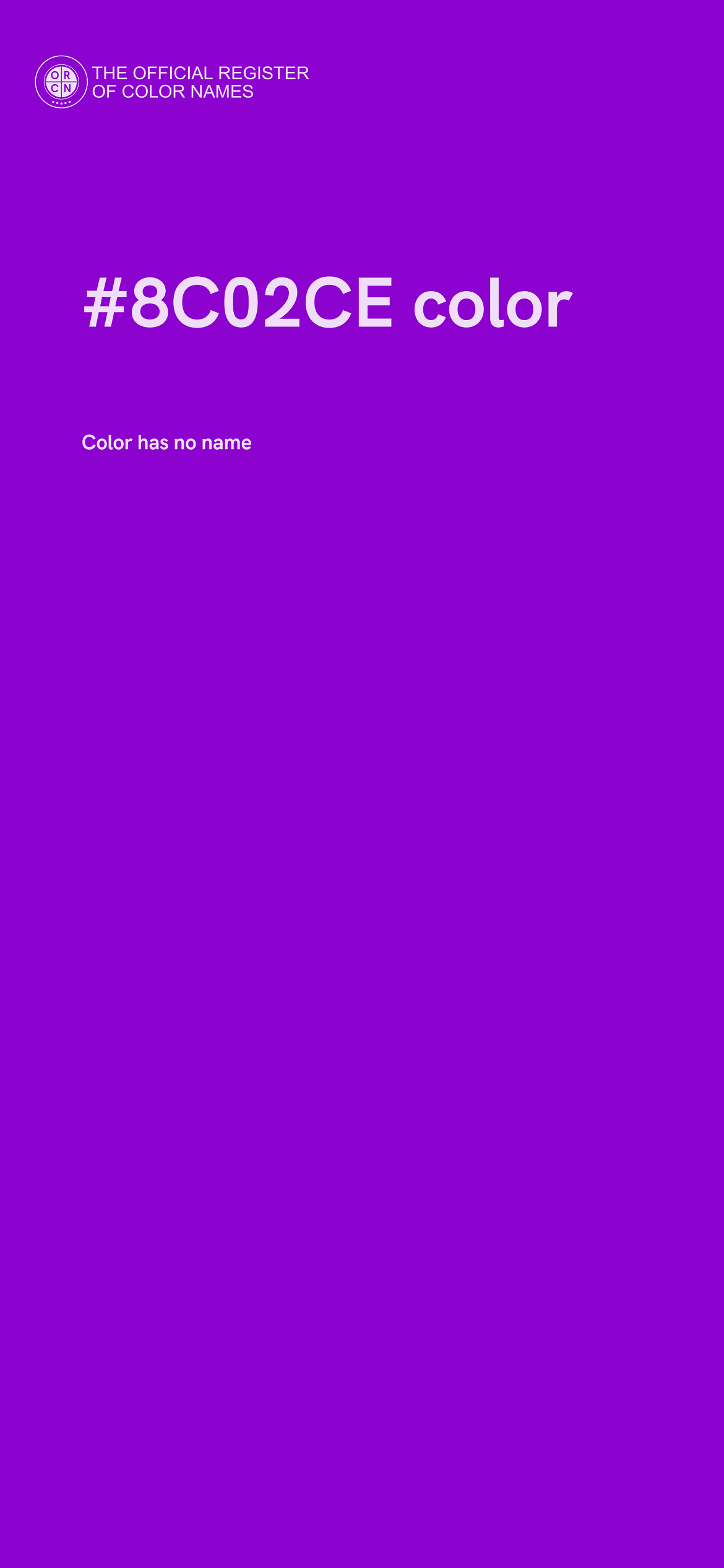 The digital color HEX #8C02CE belongs to the Violet Color Family featuring Full Saturation (Saturation Family) and Light (Brightness Family).