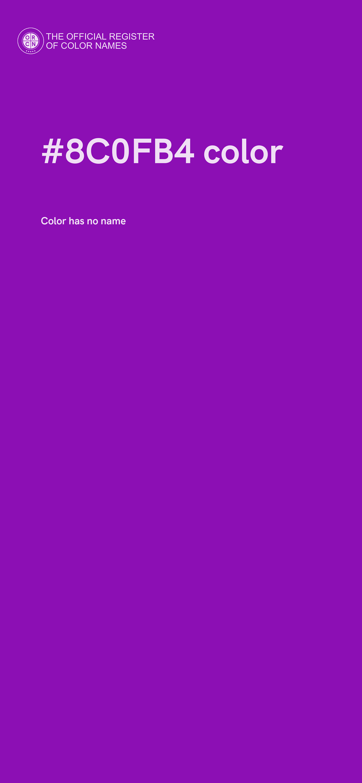 The digital color HEX #8C0FB4 belongs to the Magenta Color Family featuring Full Saturation (Saturation Family) and Neutral (Brightness Family).