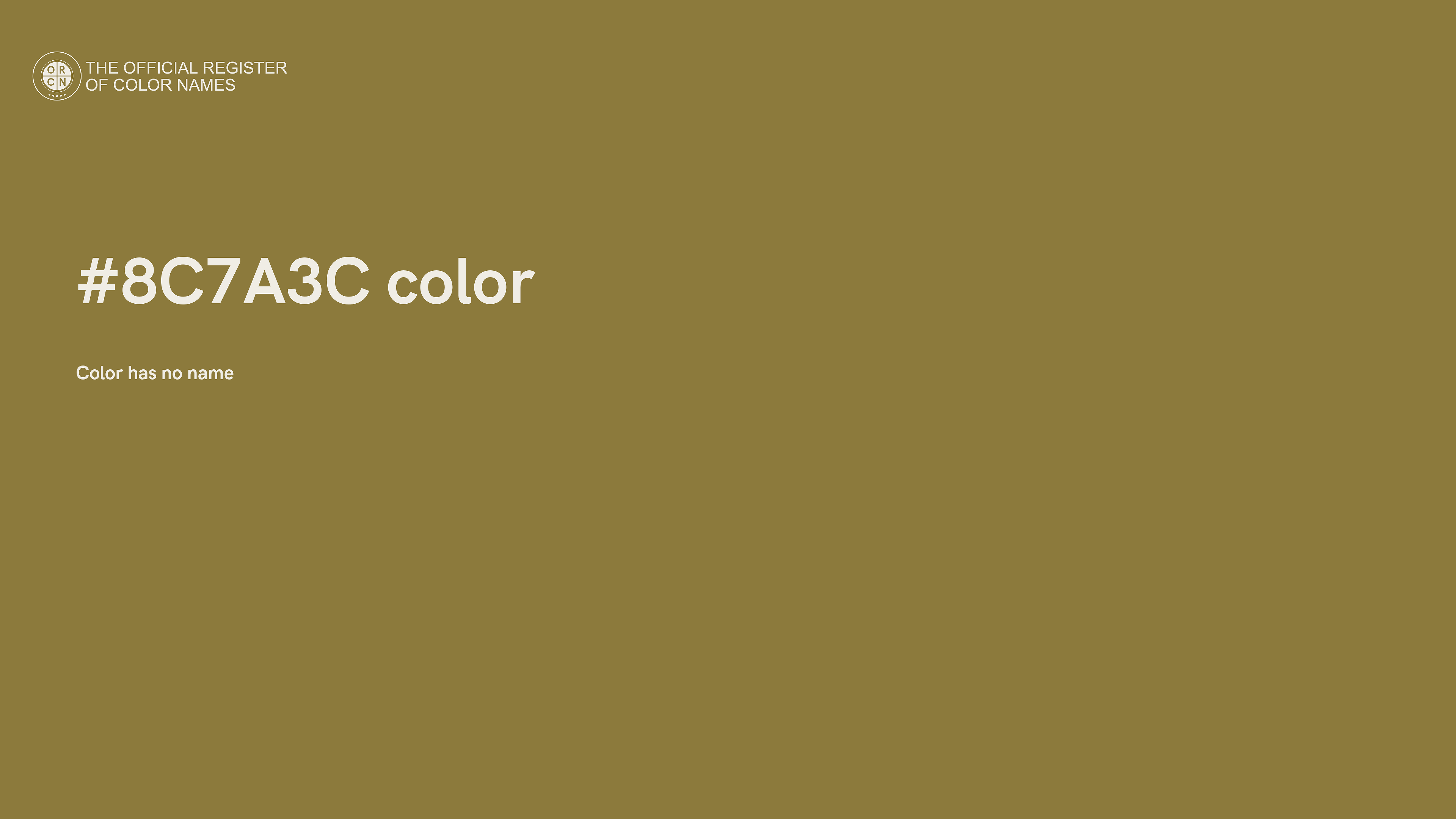 For printing in non digital world, #8C7A3C is represented in CMYK as 0 Cyan, 7 Magenta, 31 Yellow, and 45 Black (Key) (C:0 M:7 Y:31 K:45).