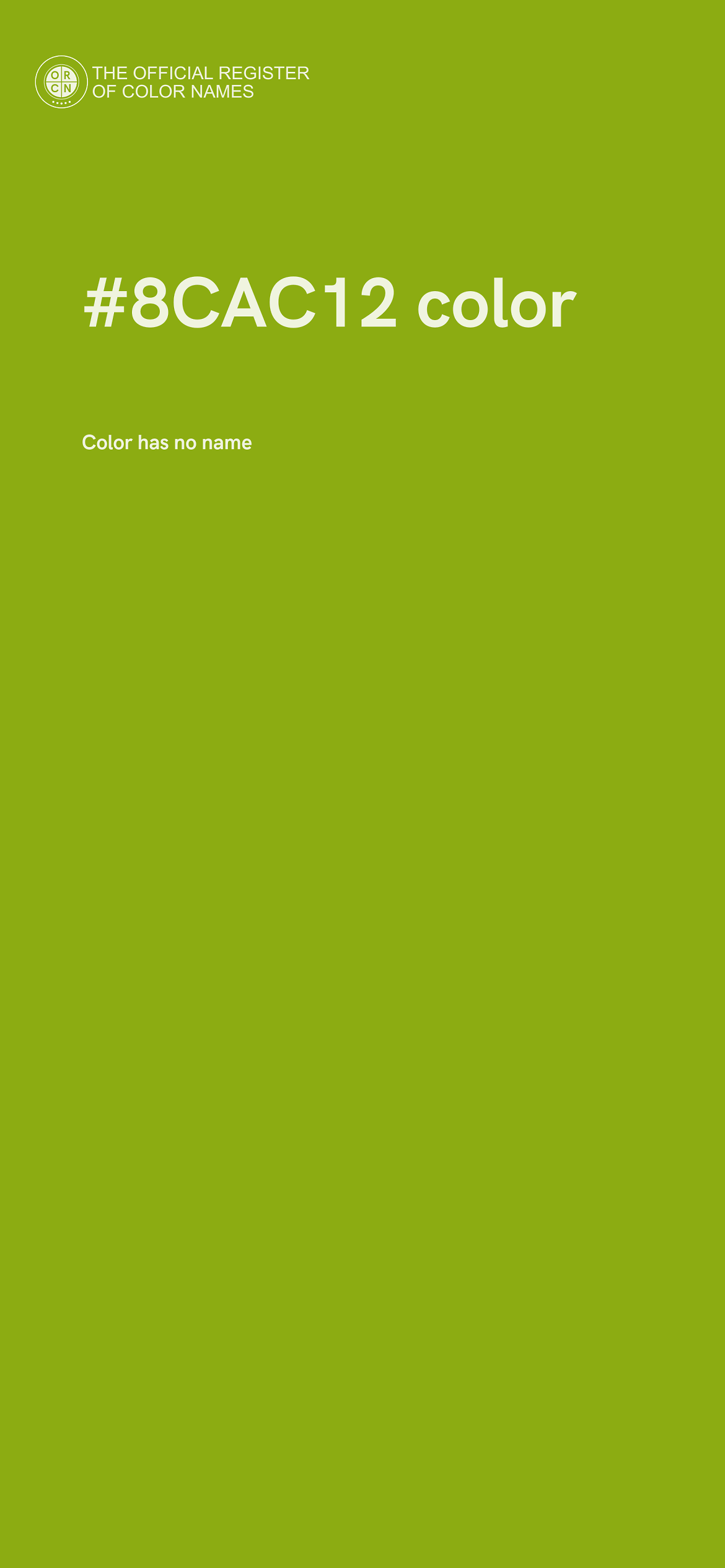 For printing in non digital world, #8CAC12 is represented in CMYK as 13 Cyan, 0 Magenta, 60 Yellow, and 33 Black (Key) (C:13 M:0 Y:60 K:33).