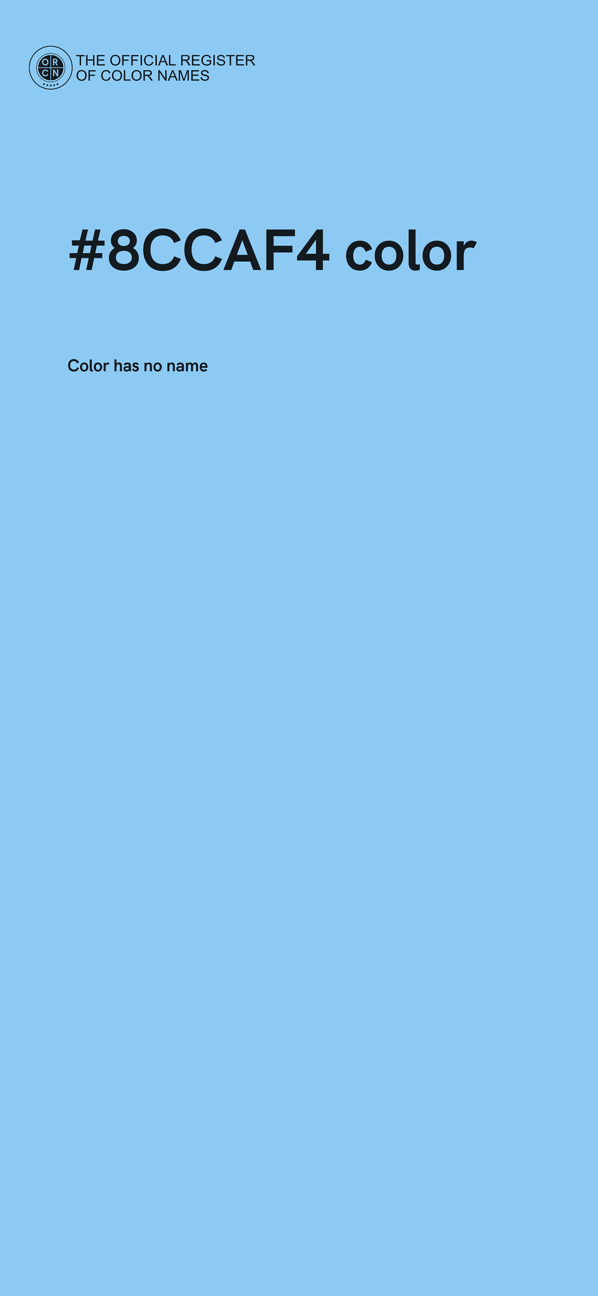 The digital color HEX #8CCAF4 belongs to the Azure Color Family featuring High Saturation (Saturation Family) and Very Light (Brightness Family).