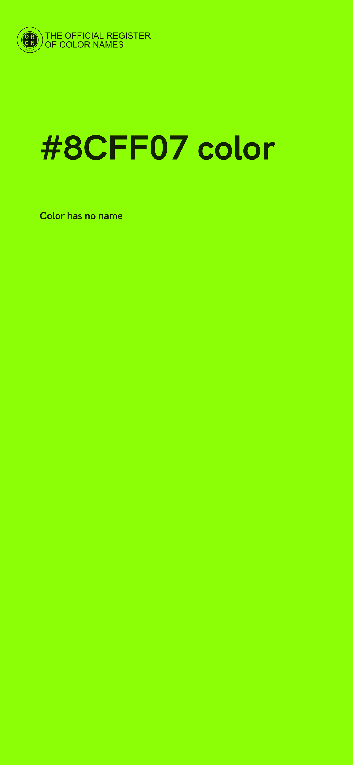 The digital color HEX #8CFF07 belongs to the Chartreuse Color Family featuring Full Saturation (Saturation Family) and Light (Brightness Family).