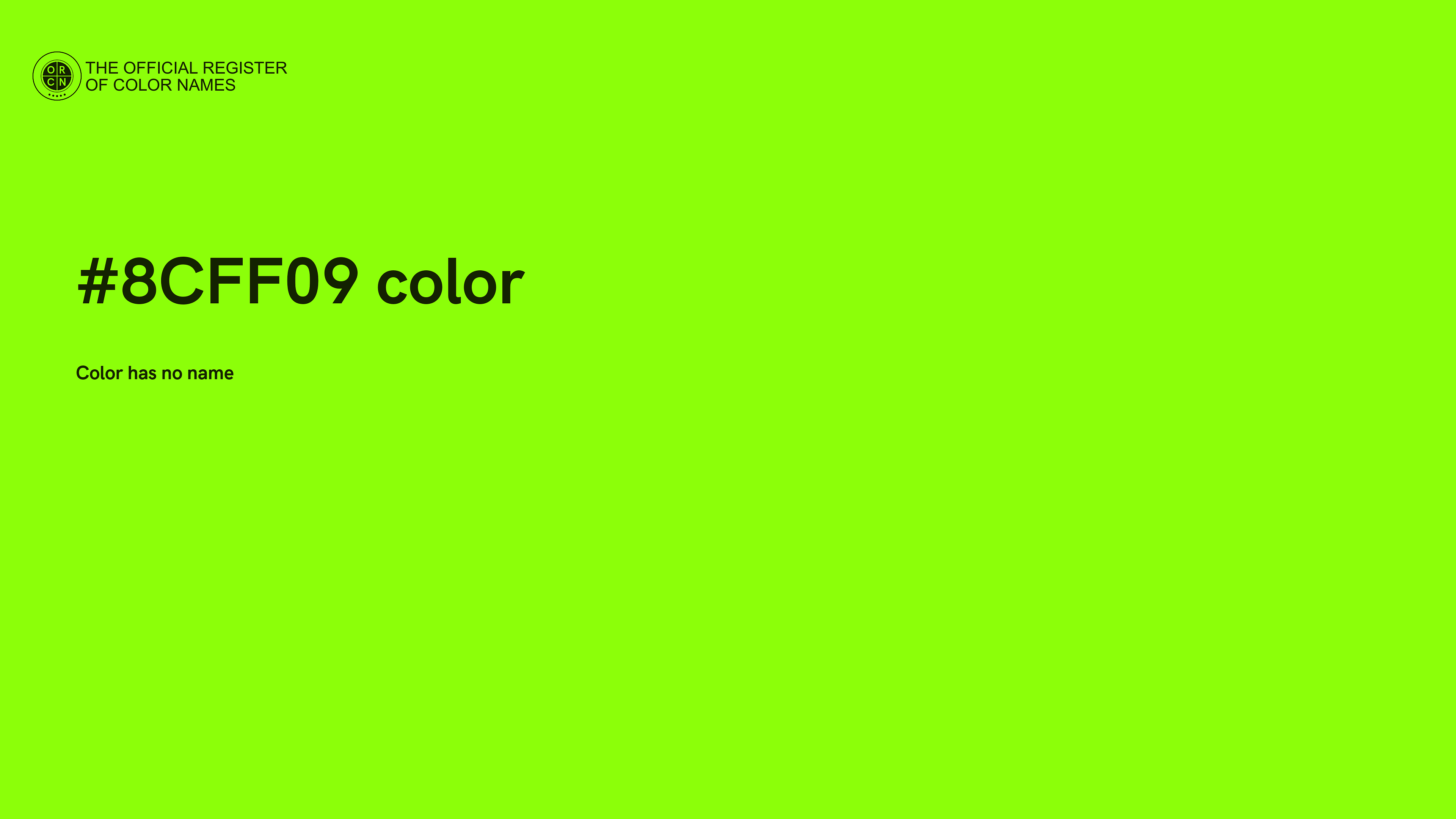 The digital color HEX #8CFF09 belongs to the Chartreuse Color Family featuring Full Saturation (Saturation Family) and Light (Brightness Family).