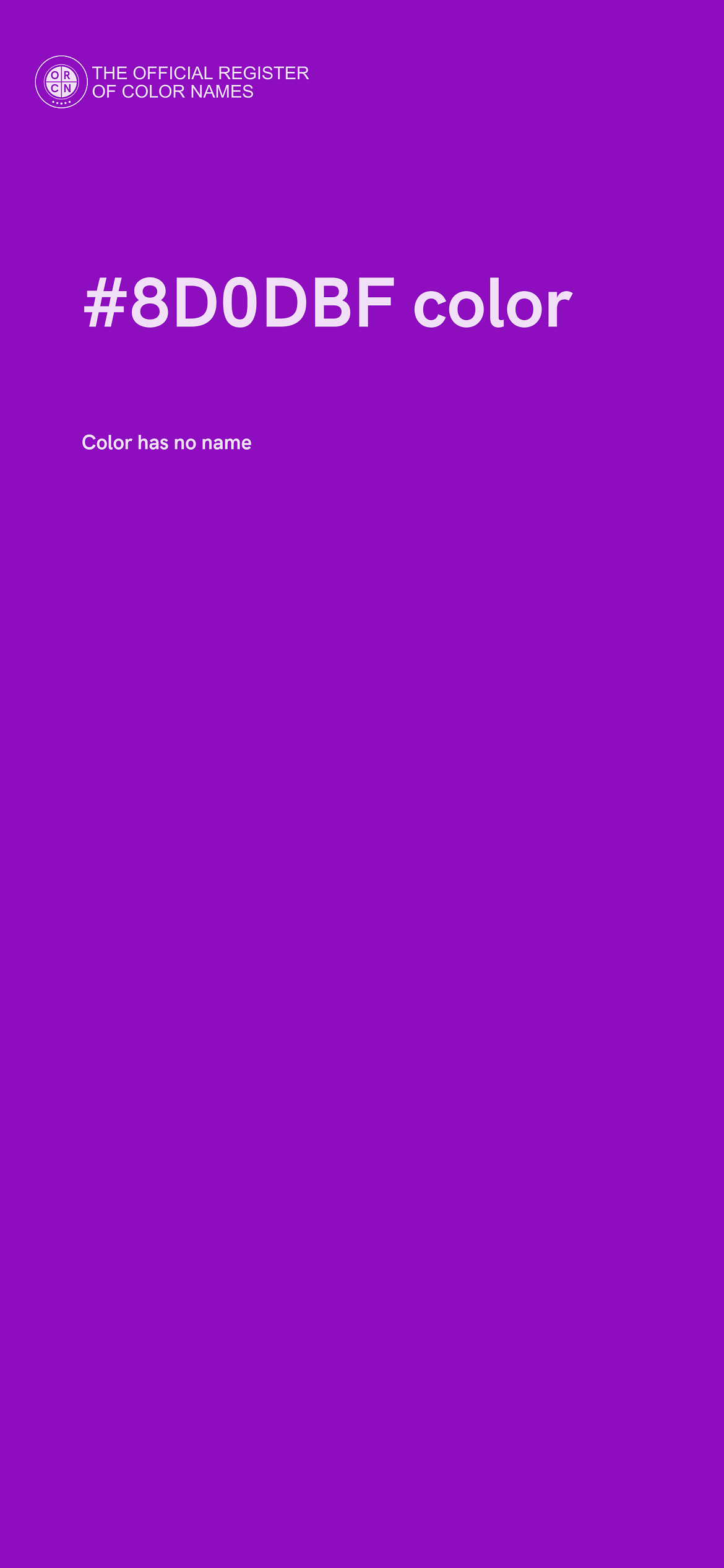 The digital color HEX #8D0DBF belongs to the Violet Color Family featuring Full Saturation (Saturation Family) and Light (Brightness Family).