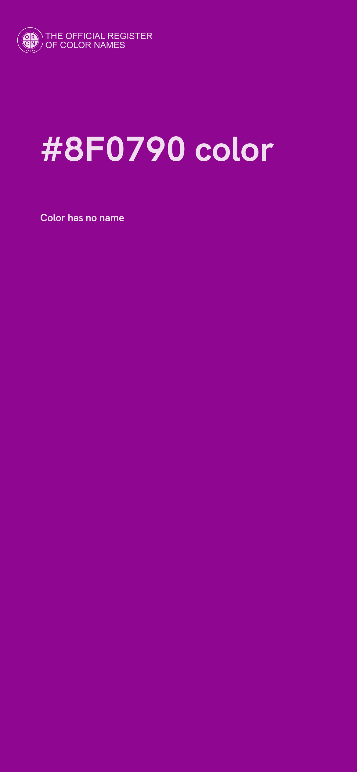 The digital color HEX #8F0790 belongs to the Magenta Color Family featuring Full Saturation (Saturation Family) and Neutral (Brightness Family).