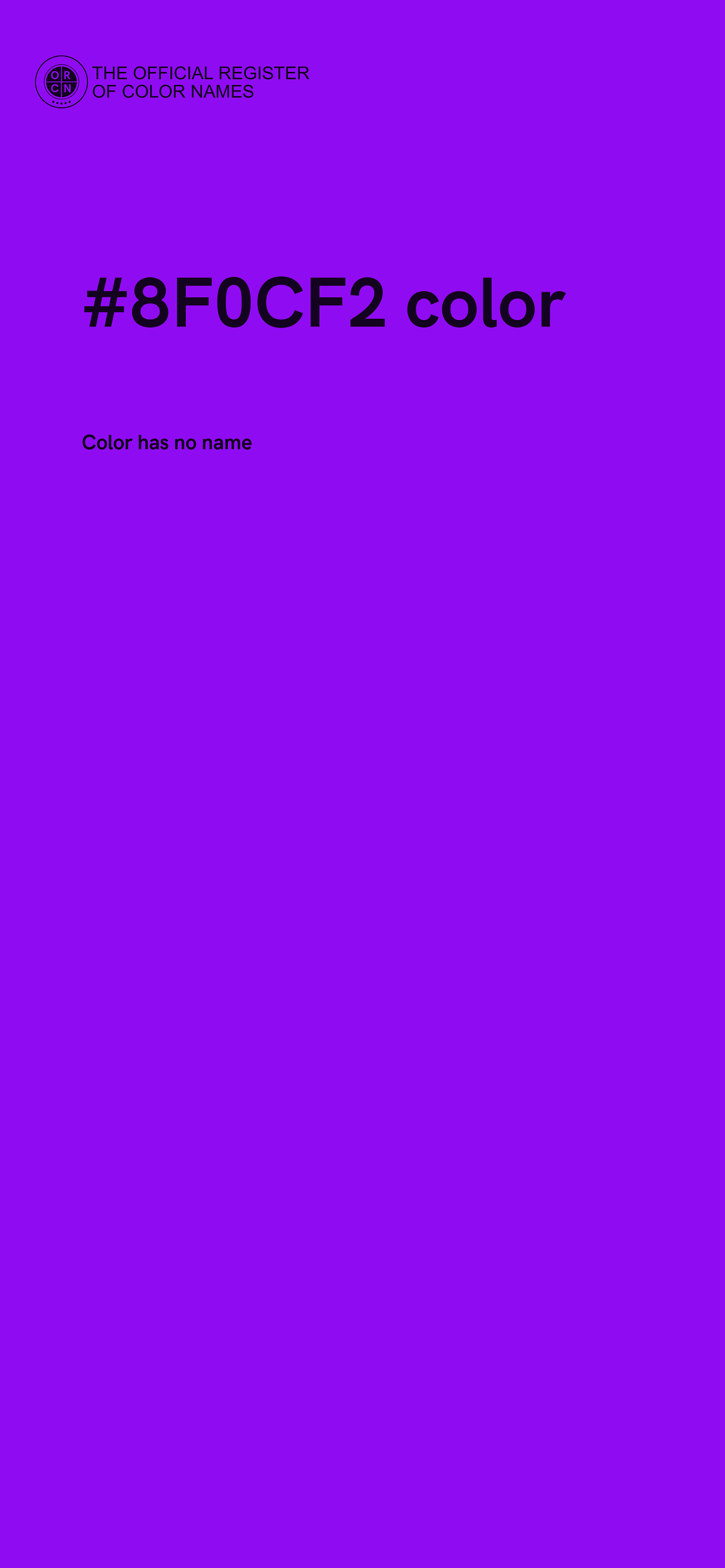 The digital color HEX #8F0CF2 belongs to the Violet Color Family featuring Full Saturation (Saturation Family) and Light (Brightness Family).