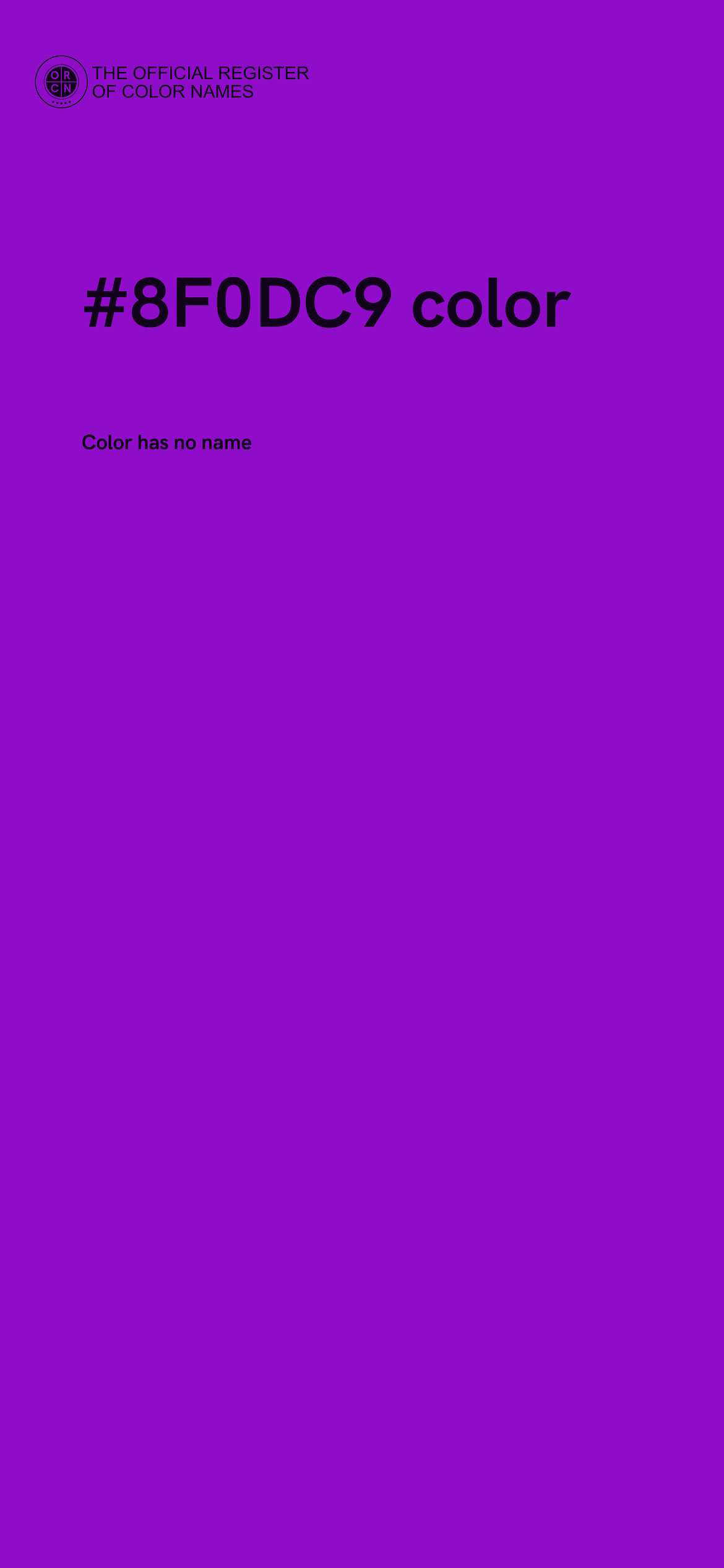 The digital color HEX #8F0DC9 belongs to the Violet Color Family featuring Full Saturation (Saturation Family) and Light (Brightness Family).