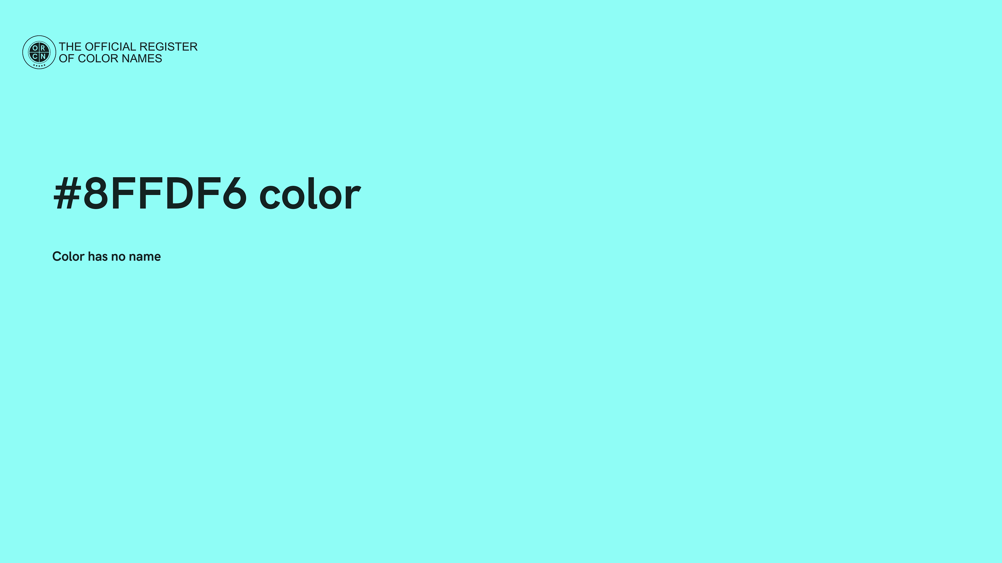 The digital color HEX #8FFDF6 belongs to the Cyan Color Family featuring Full Saturation (Saturation Family) and Very Light (Brightness Family).