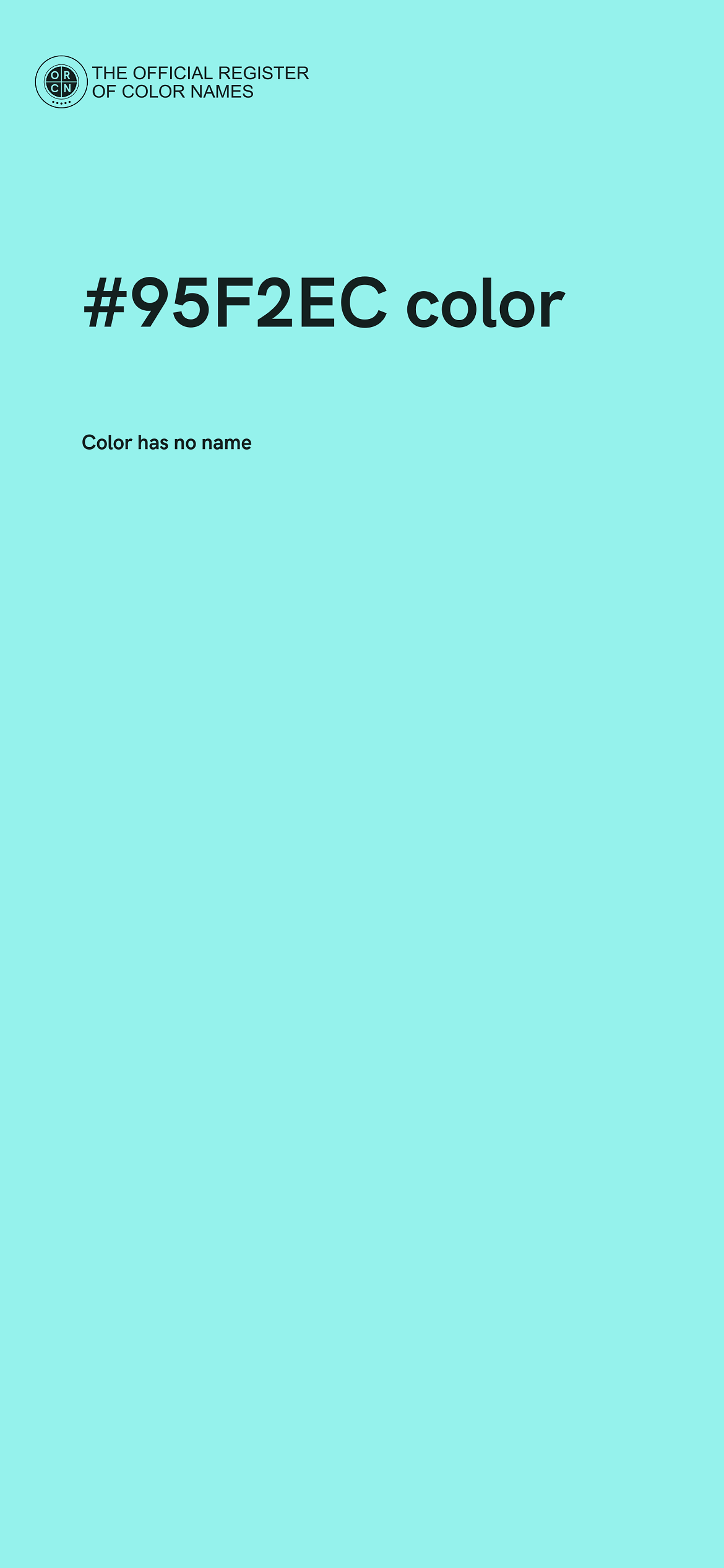 The digital color HEX #95F2EC belongs to the Cyan Color Family featuring High Saturation (Saturation Family) and Very Light (Brightness Family).