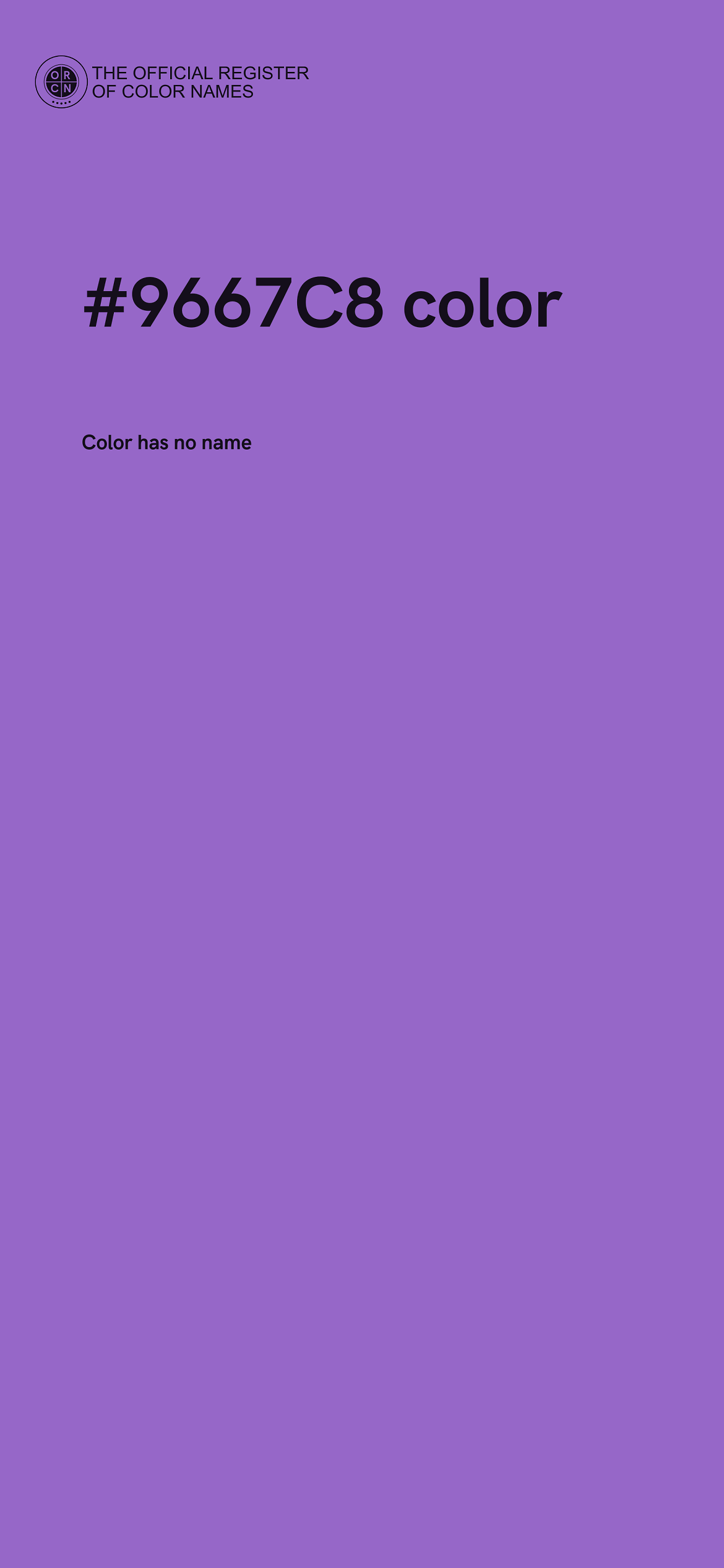 The digital color HEX #9667C8 belongs to the Violet Color Family featuring Moderate Saturation (Saturation Family) and Light (Brightness Family).