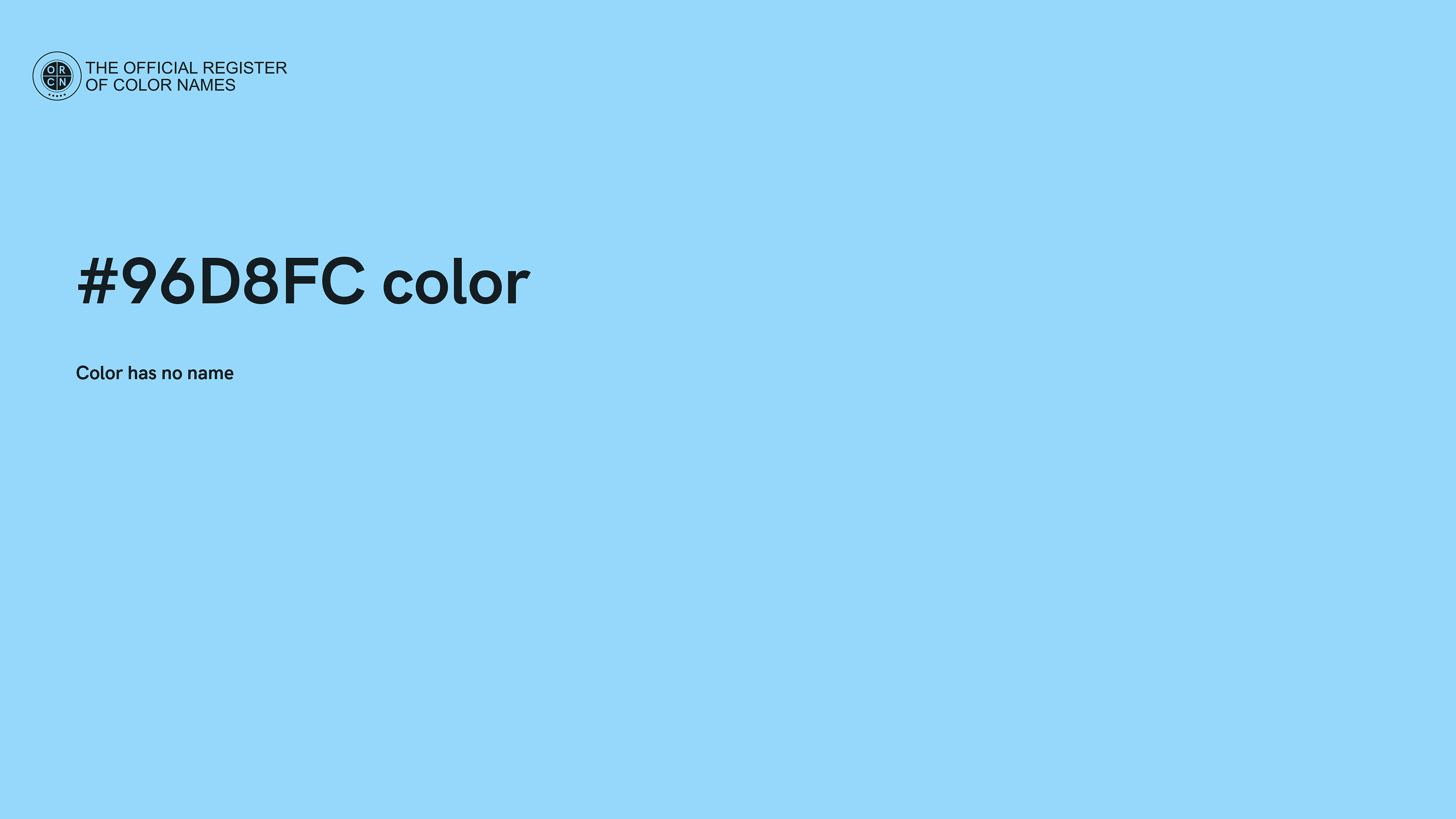 The digital color HEX #96D8FC belongs to the Azure Color Family featuring Full Saturation (Saturation Family) and Very Light (Brightness Family).