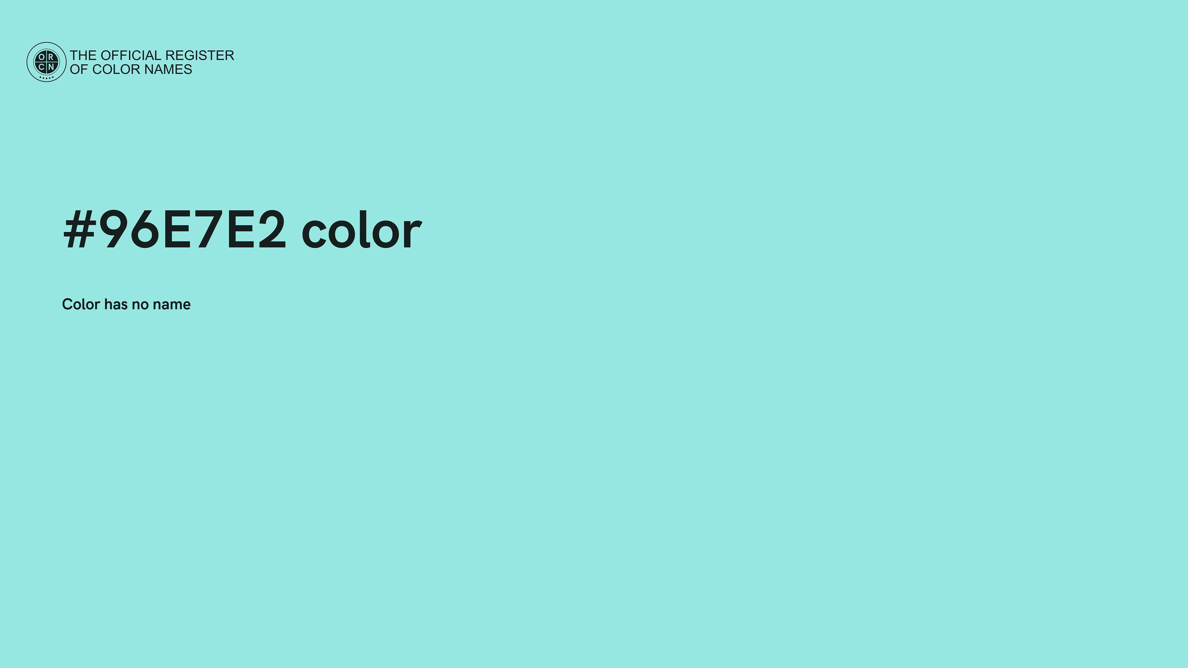 The digital color HEX #96E7E2 belongs to the Cyan Color Family featuring High Saturation (Saturation Family) and Very Light (Brightness Family).