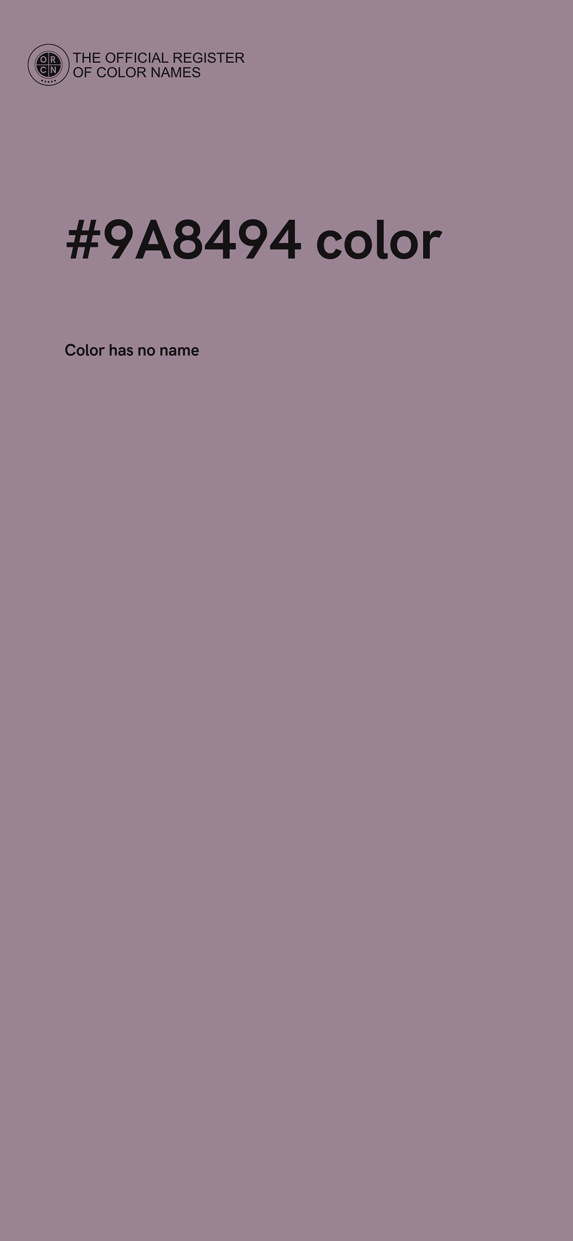 The digital color HEX #9A8494 belongs to the Rose Color Family featuring Low Saturation (Saturation Family) and Light (Brightness Family).