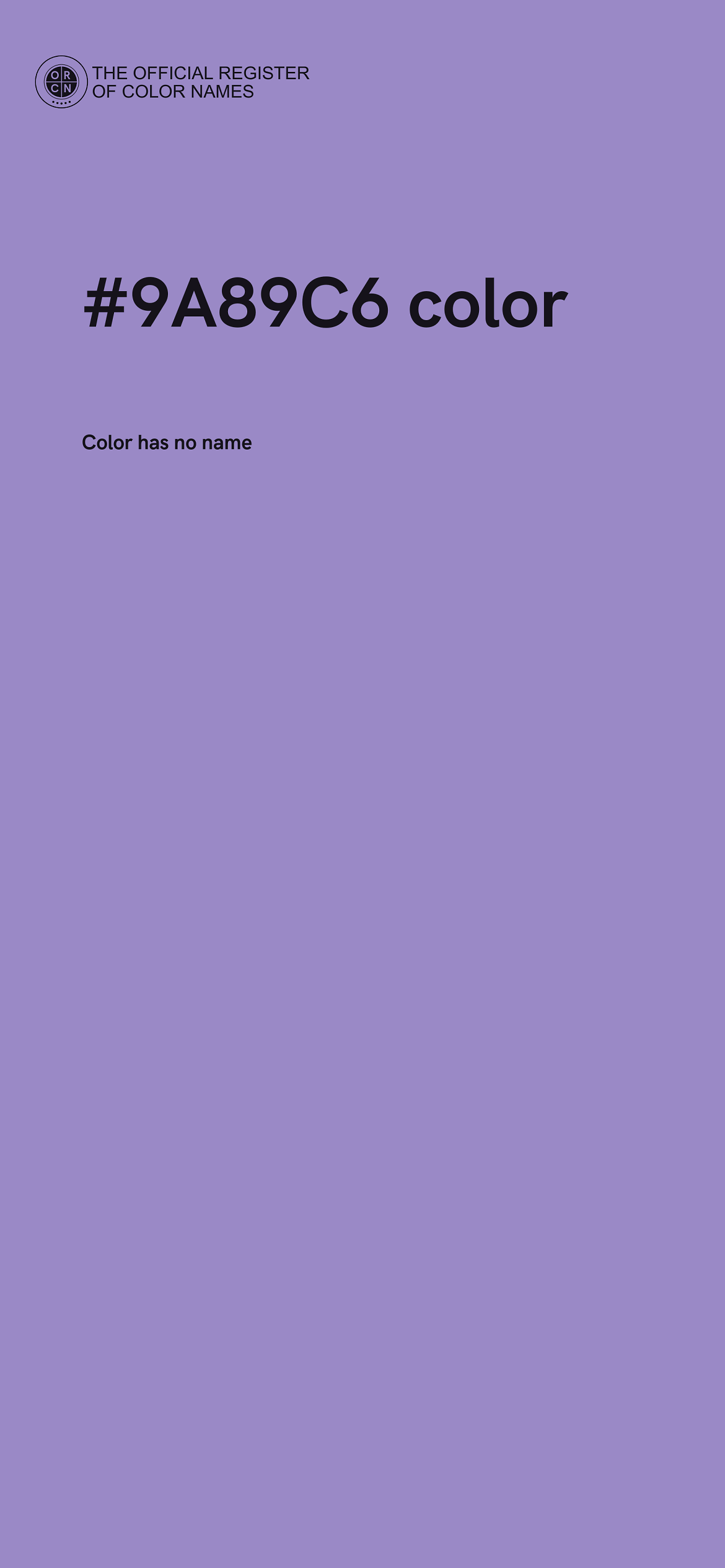 For printing in non digital world, #9A89C6 is represented in CMYK as 17 Cyan, 24 Magenta, 0 Yellow, and 22 Black (Key) (C:17 M:24 Y:0 K:22).