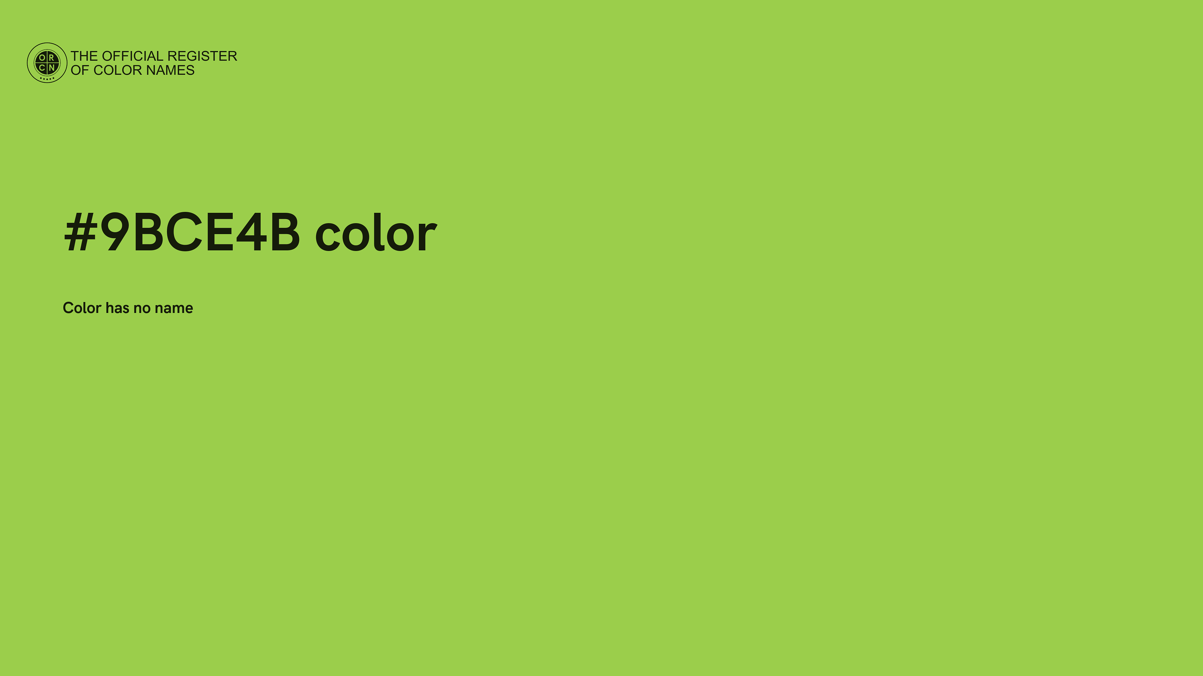 The digital color HEX #9BCE4B belongs to the Chartreuse Color Family featuring Moderate Saturation (Saturation Family) and Light (Brightness Family).