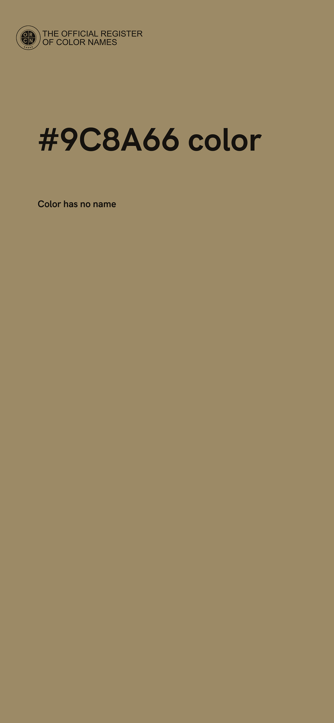 The digital color HEX #9C8A66 belongs to the Orange Color Family featuring Low Saturation (Saturation Family) and Light (Brightness Family).