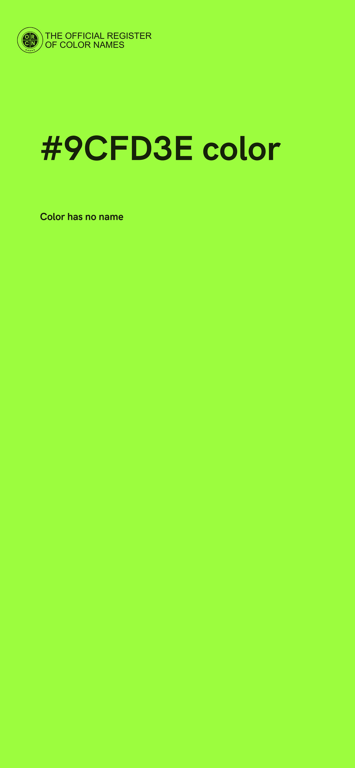 The digital color HEX #9CFD3E belongs to the Chartreuse Color Family featuring Full Saturation (Saturation Family) and Very Light (Brightness Family).