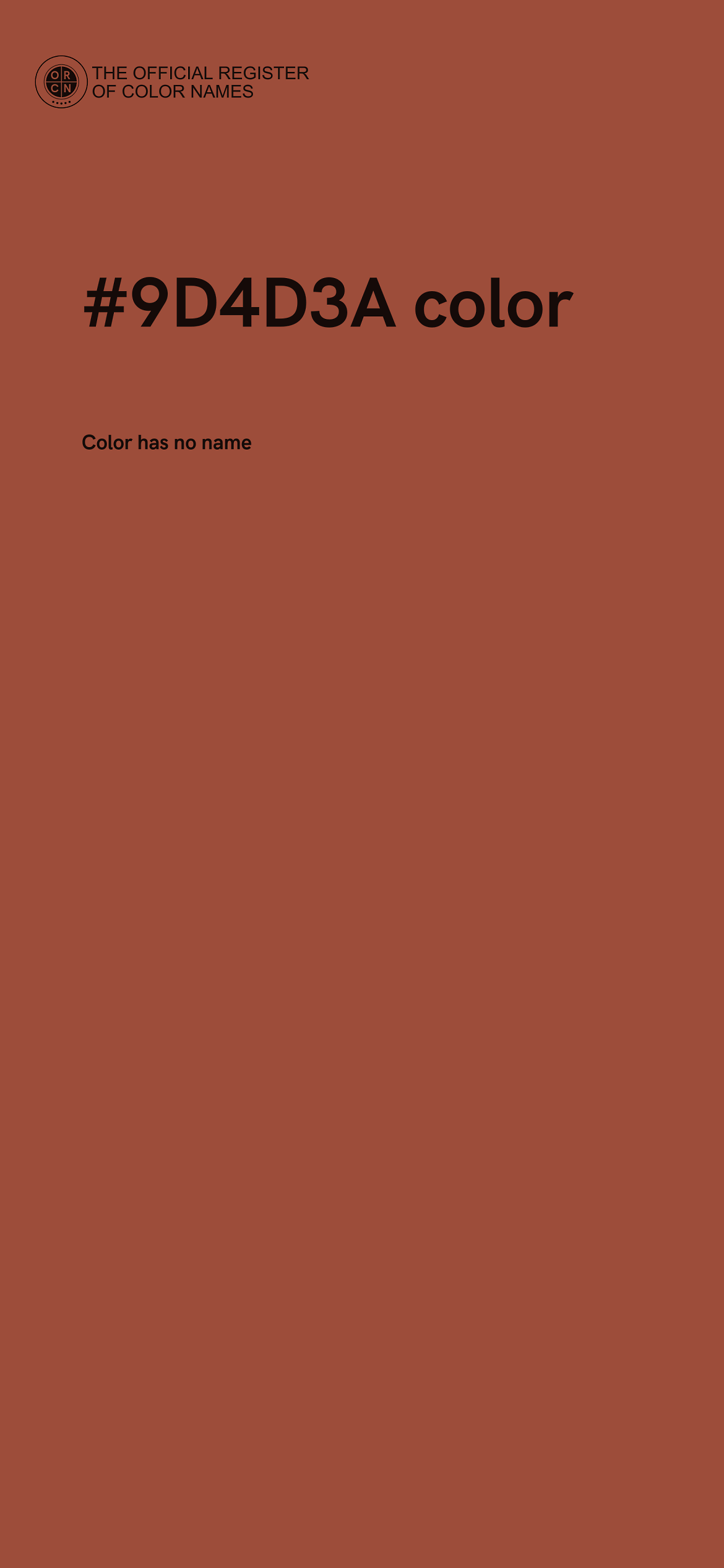 For printing in non digital world, #9D4D3A is represented in CMYK as 0 Cyan, 31 Magenta, 39 Yellow, and 38 Black (Key) (C:0 M:31 Y:39 K:38).