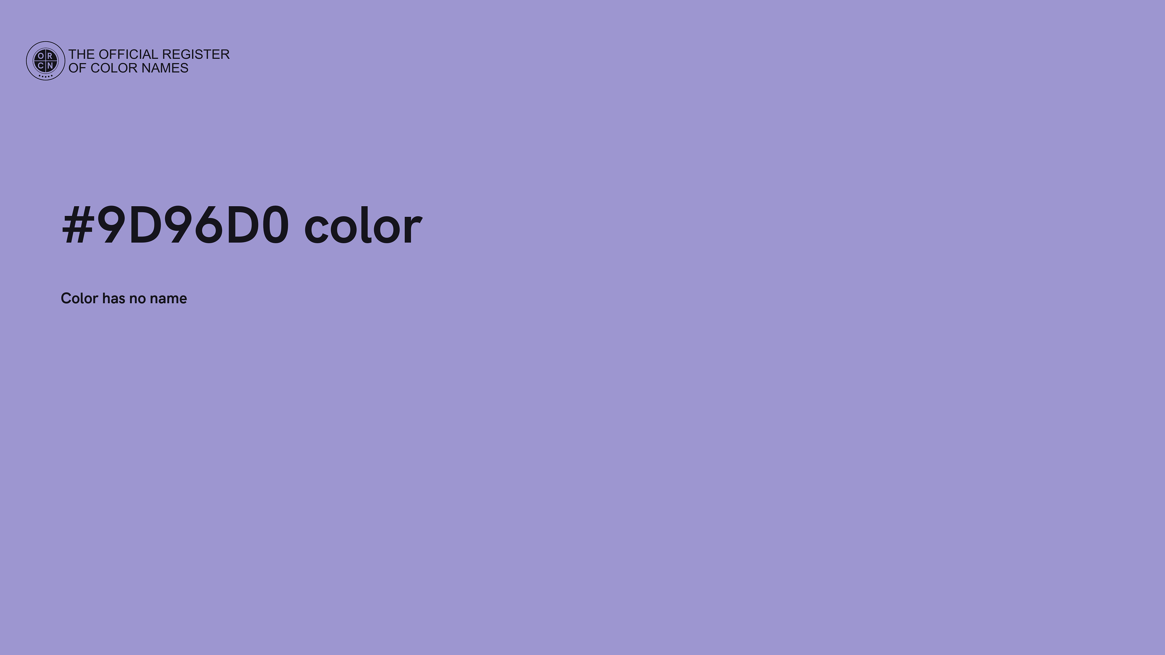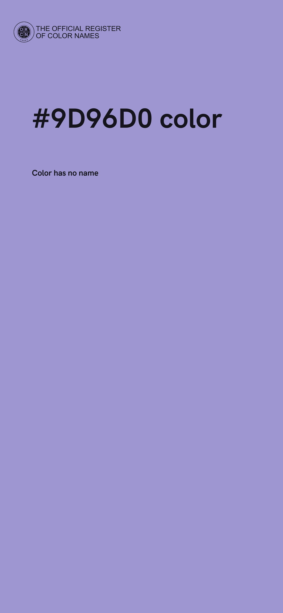 The digital color HEX #9D96D0 belongs to the Blue Color Family featuring Mild Saturation (Saturation Family) and Very Light (Brightness Family).