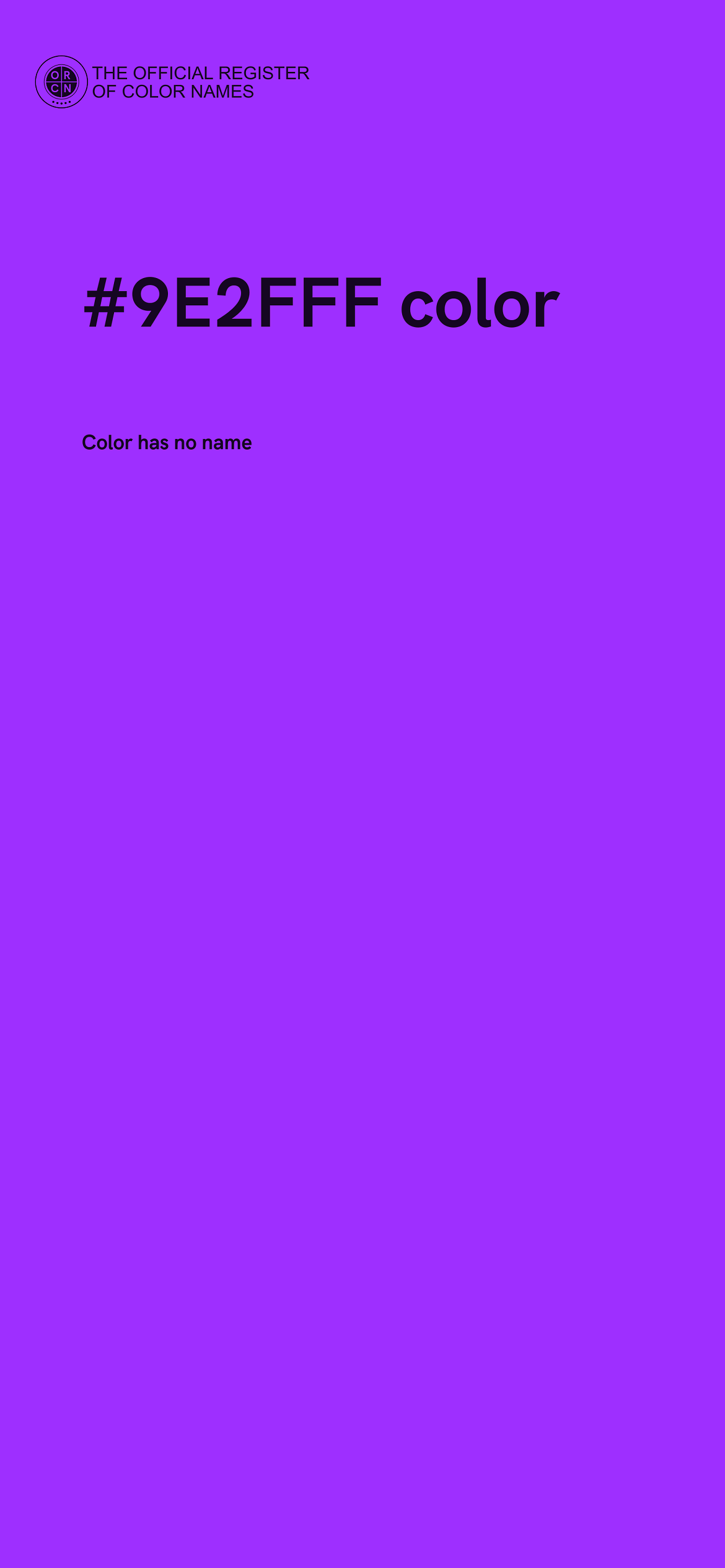The digital color HEX #9E2FFF belongs to the Violet Color Family featuring Full Saturation (Saturation Family) and Light (Brightness Family).
